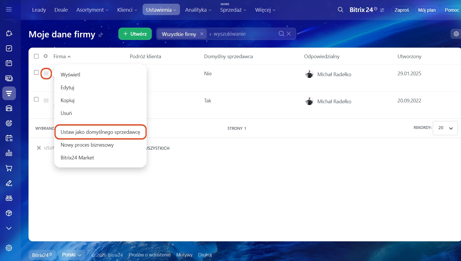 9–10. Aby zmienić firmę główną, kliknij obok wybranej firmy Menu (≡) > Ustaw jako domyślnego sprzedawcę.