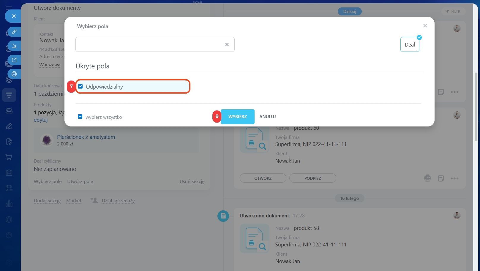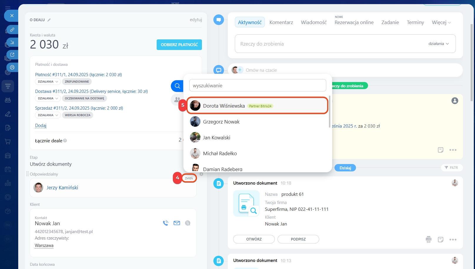 Pokażemy, jak zmienić odpowiedzialnego w formularzu deala. Te same kroki działają również dla pozostałych elementów CRM.