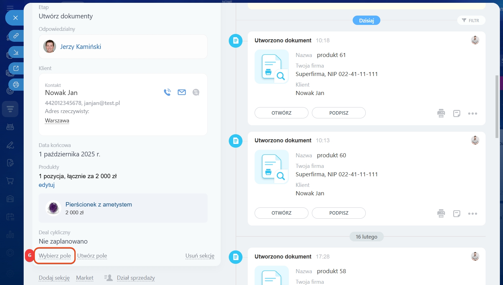 1–3. Przejdź do sekcji CRM → Deale i otwórz wybrany.