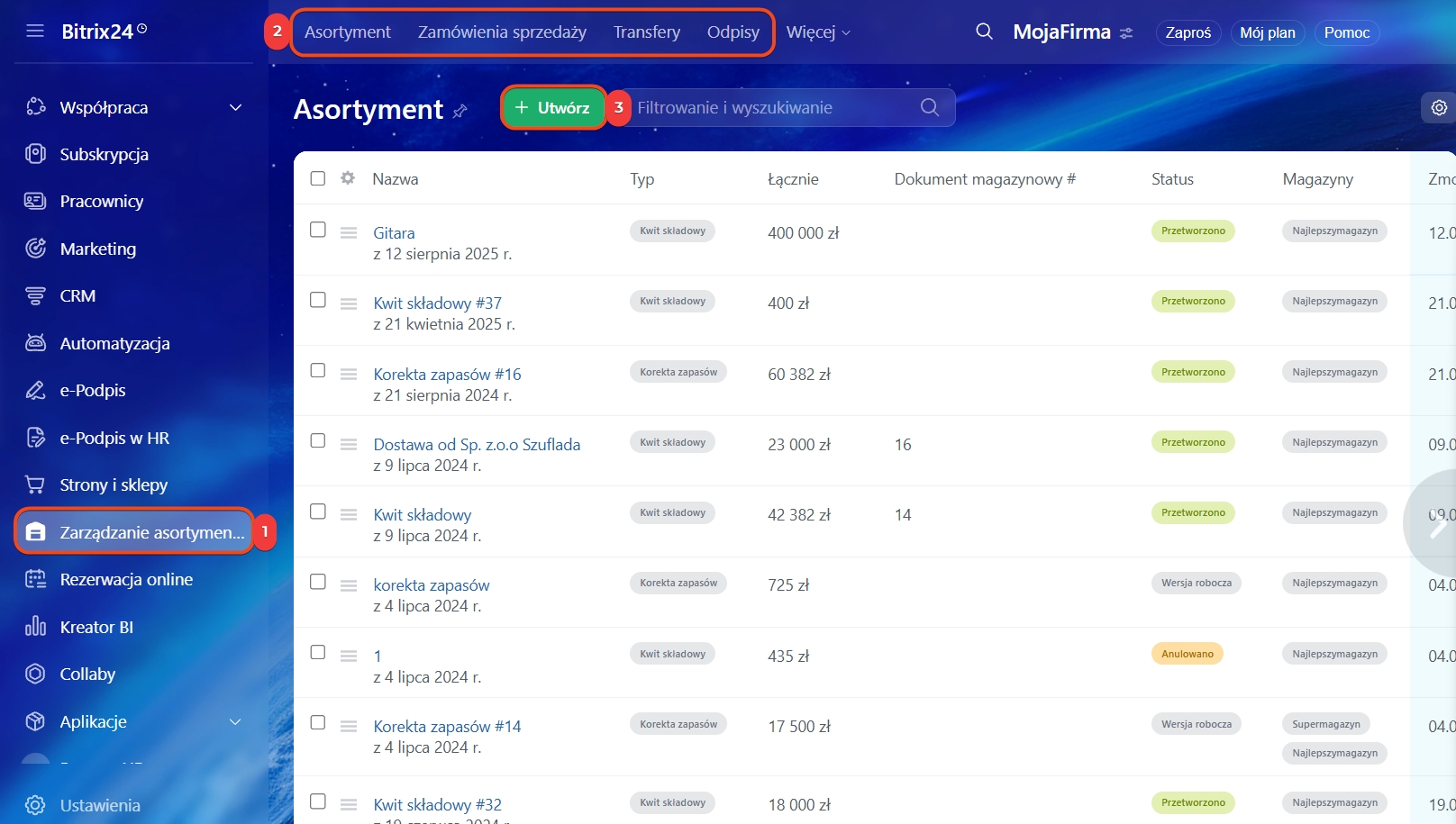 1–3. Przejdź do sekcji Zarządzanie Asortymentem, wybierz odpowiedni typ dokumentu i kliknij Utwórz.