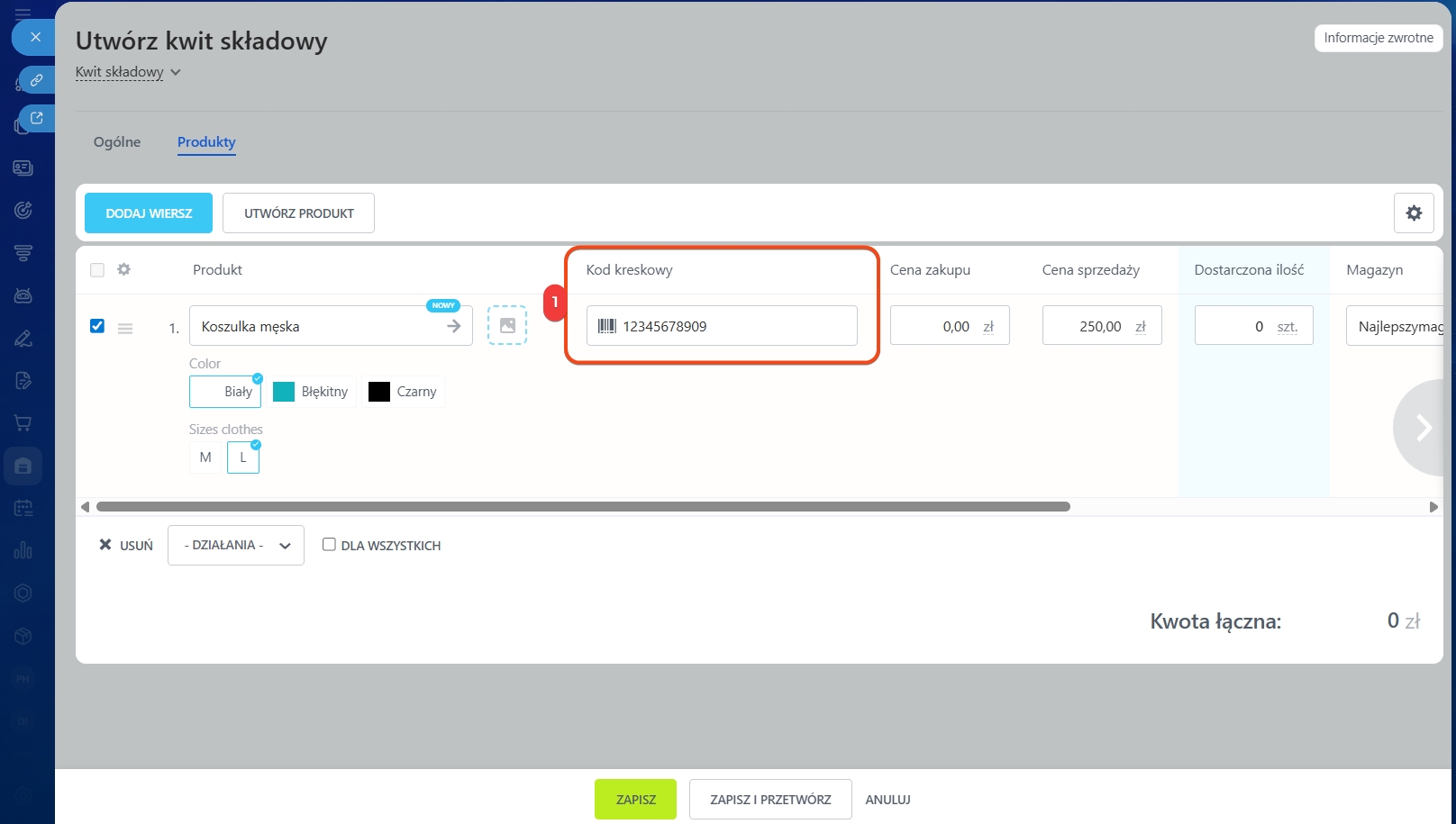 4. W dokumencie kliknij pole Kod kreskowy i zeskanuj kod produktu.