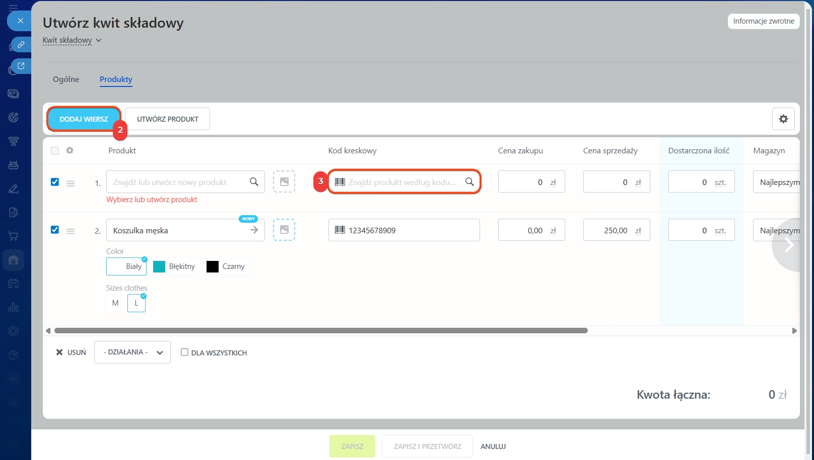 2–3. Aby dodać kolejny produkt, kliknij Dodaj wiersz, ponownie ustaw kursor w polu Kod kreskowy i zeskanuj następny kod.