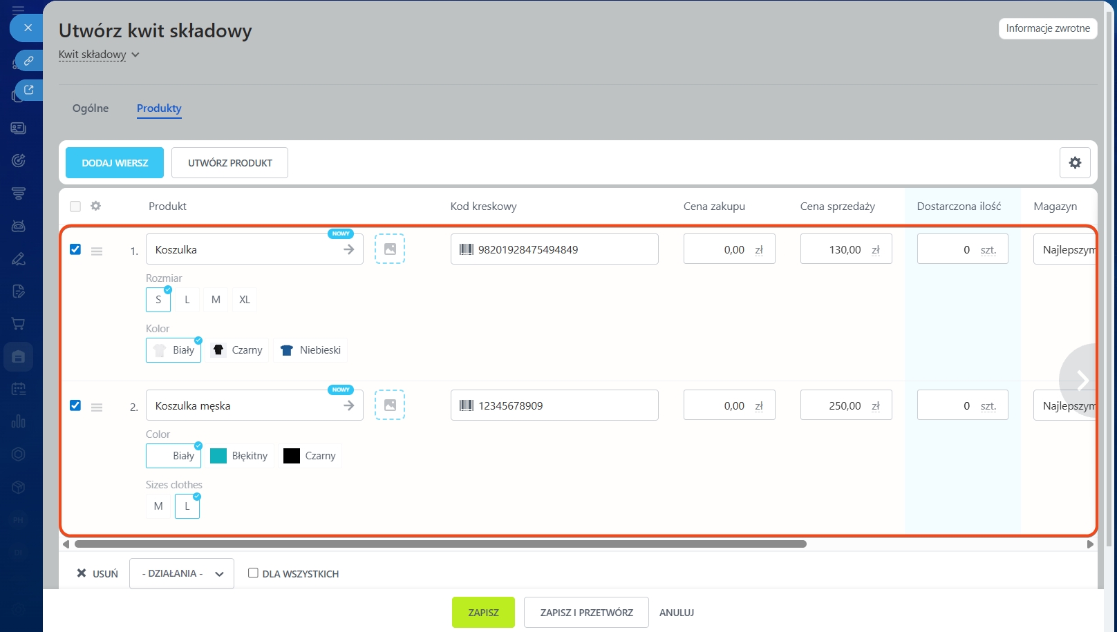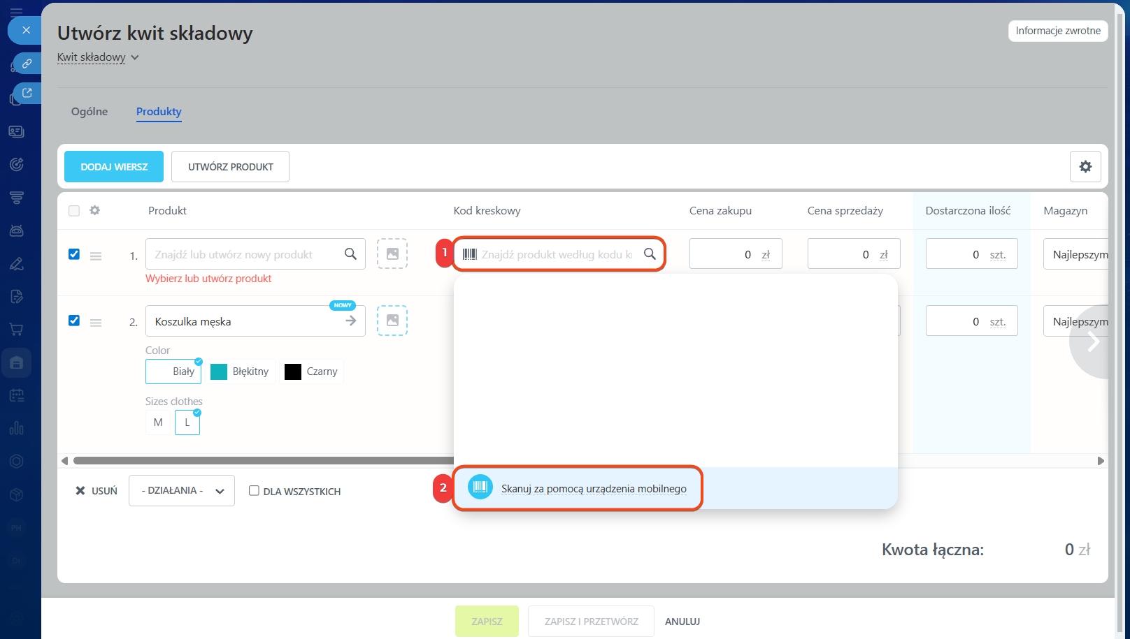 Po zeskanowaniu kodu produkt pojawi się w dokumencie. Aby dodać kilka produktów, nie zamykaj skanera – kontynuuj skanowanie kolejnych kodów. Nowe wiersze dodadzą się automatycznie.
