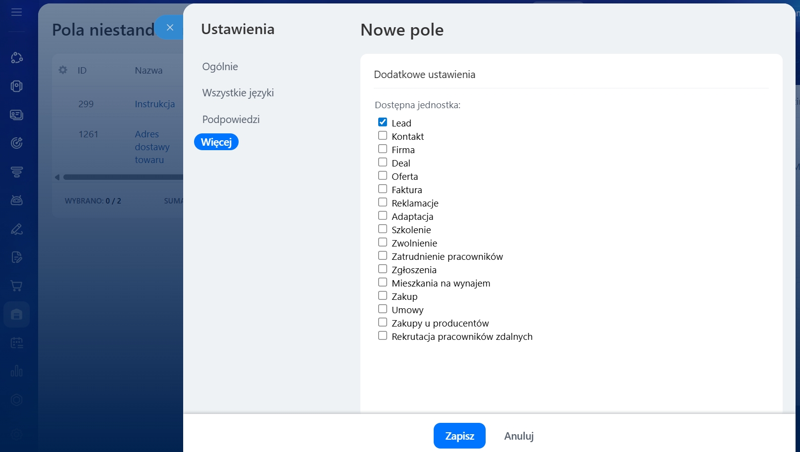 Powiąż ze słownikami CRM. Opcja Dostępna jednostka określa, z którego słownika CRM można wybierać wartości.