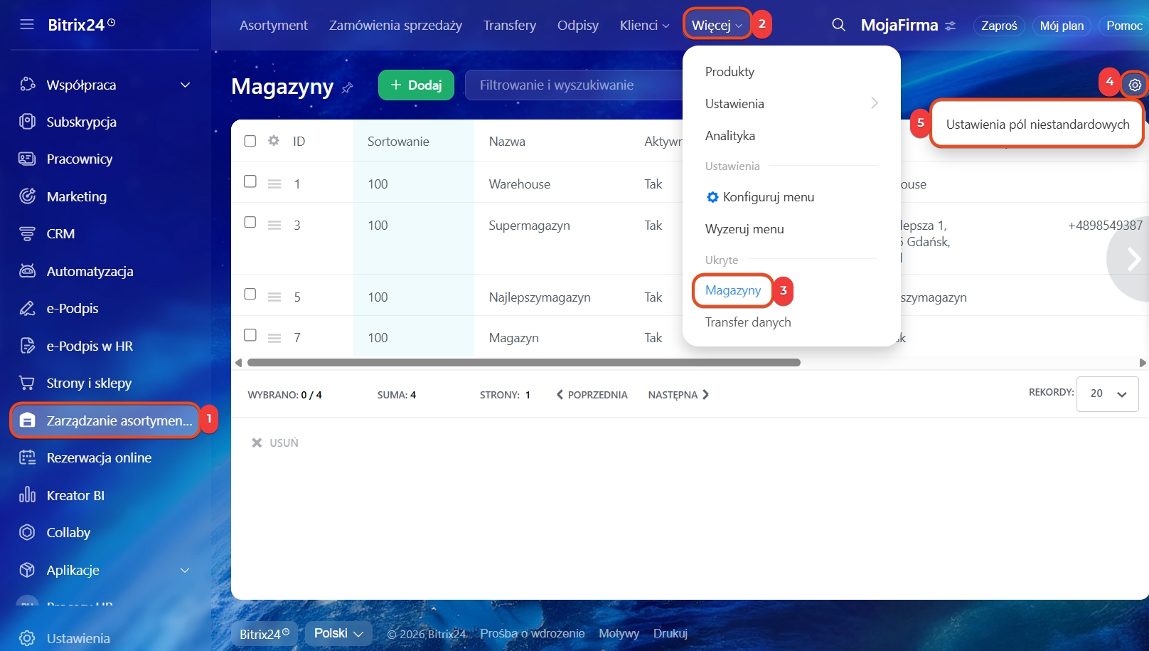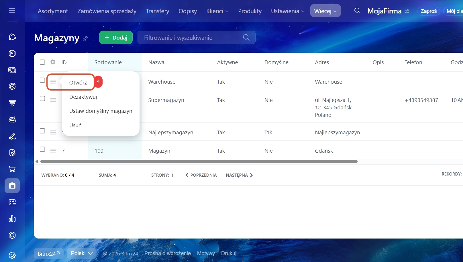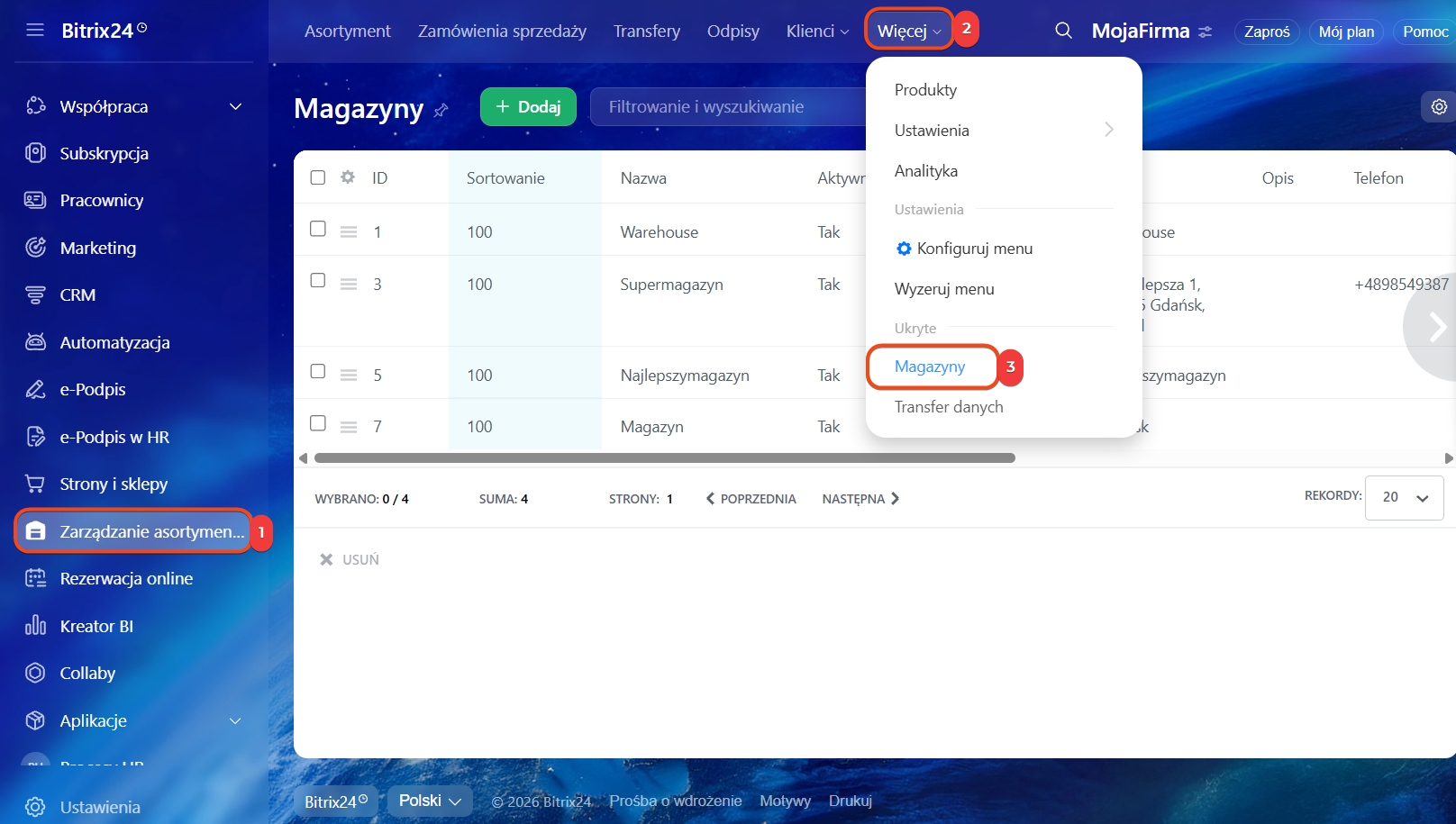 1–4. Przejdź do sekcji Zarządzanie Asortymentem → Więcej → Magazyny. Wybierz magazyn, kliknij Menu (≡) → Otwórz.
