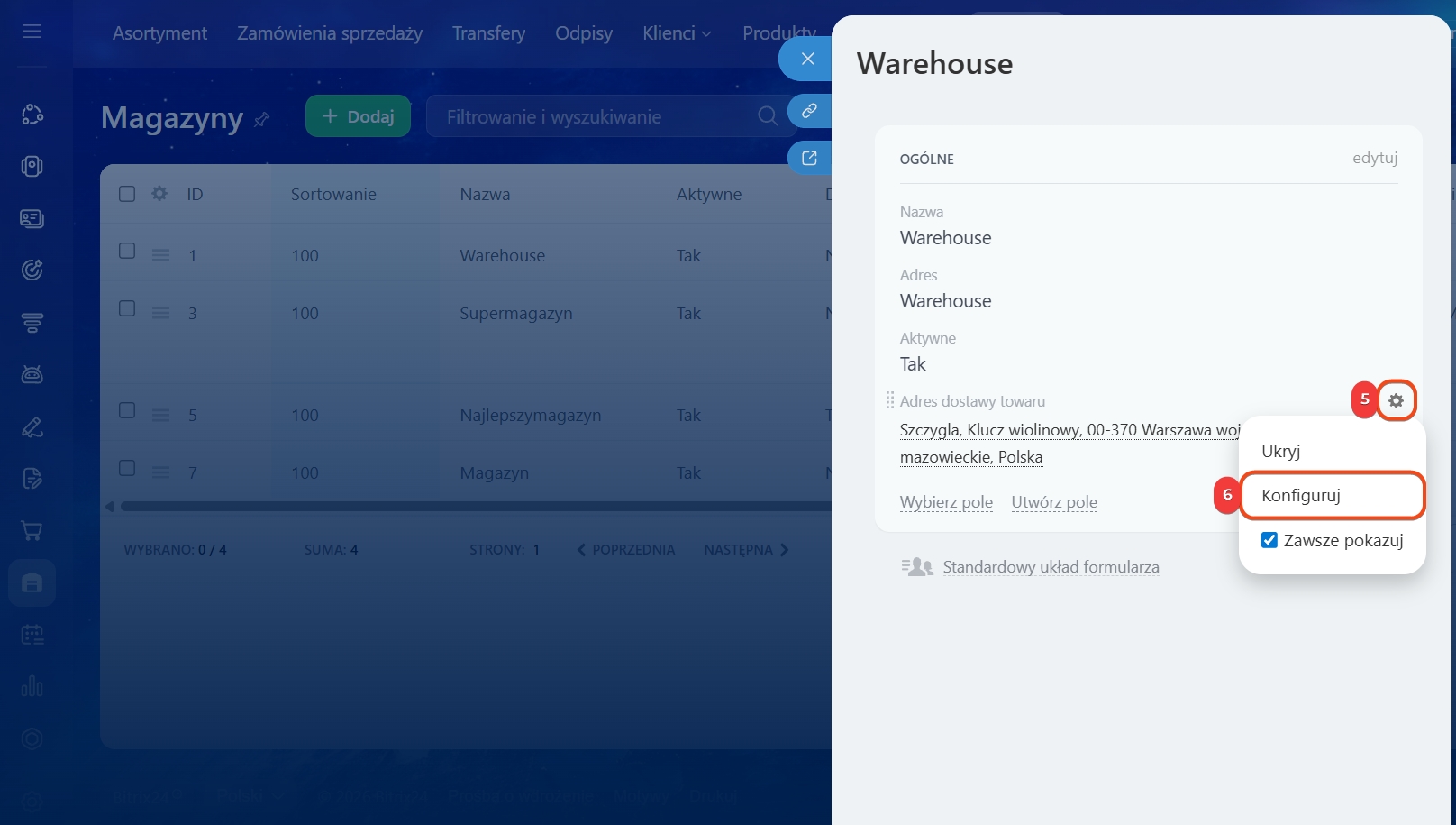 Adres. Opcja Pokazuj mapę dodaje mapę z adresem w formularzu magazynu.