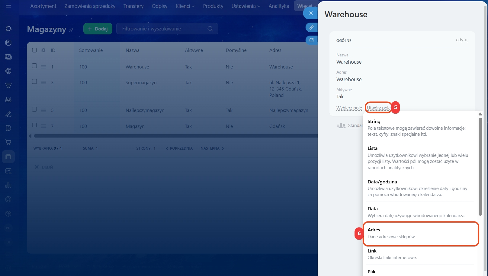 5–6. W formularzu magazynu kliknij Utwórz pole i wybierz jego typ.
