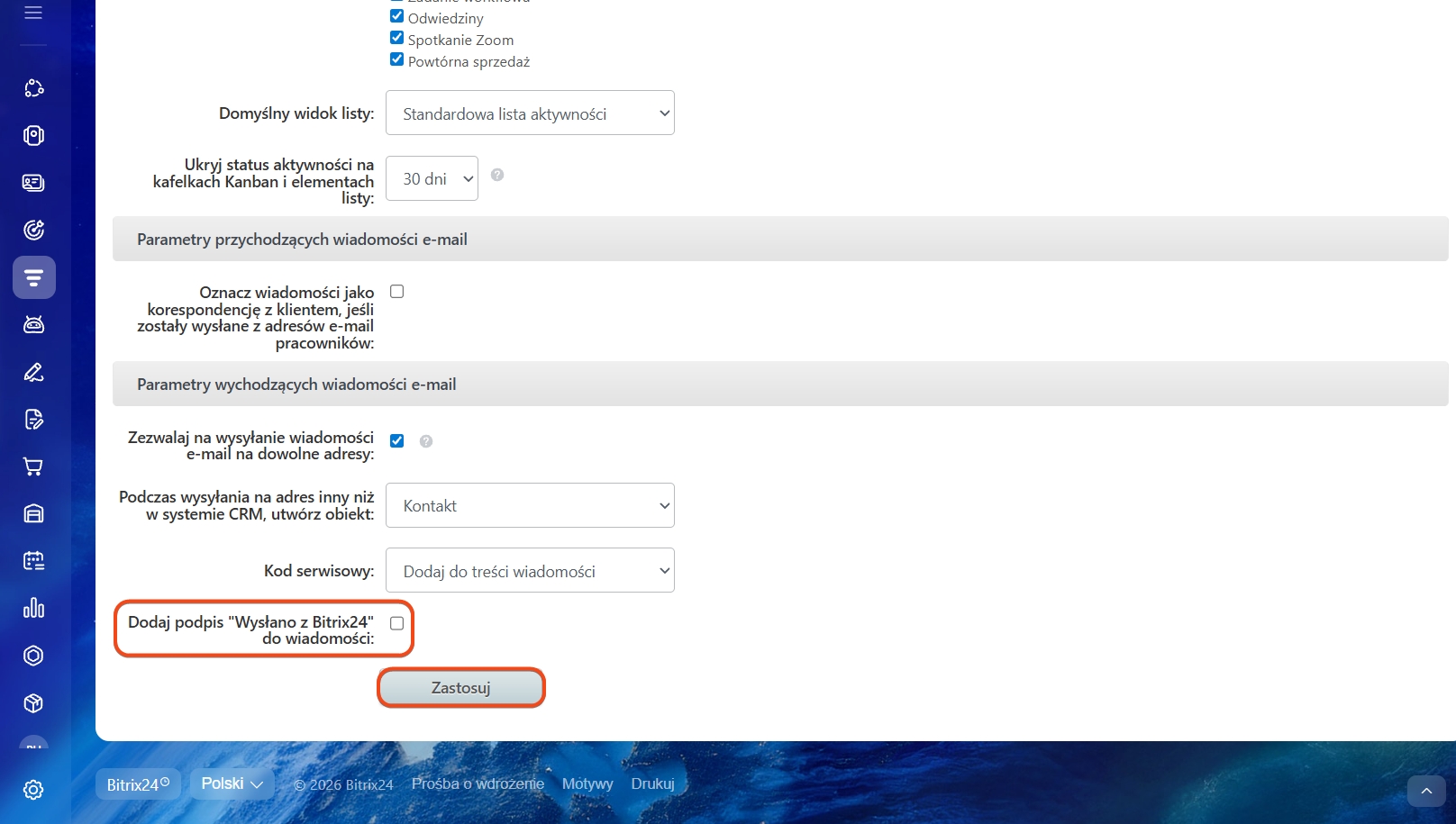 8–9. Odznacz pole Dodawaj stopkę „Wysłano z Bitrix24” i kliknij Zastosuj.