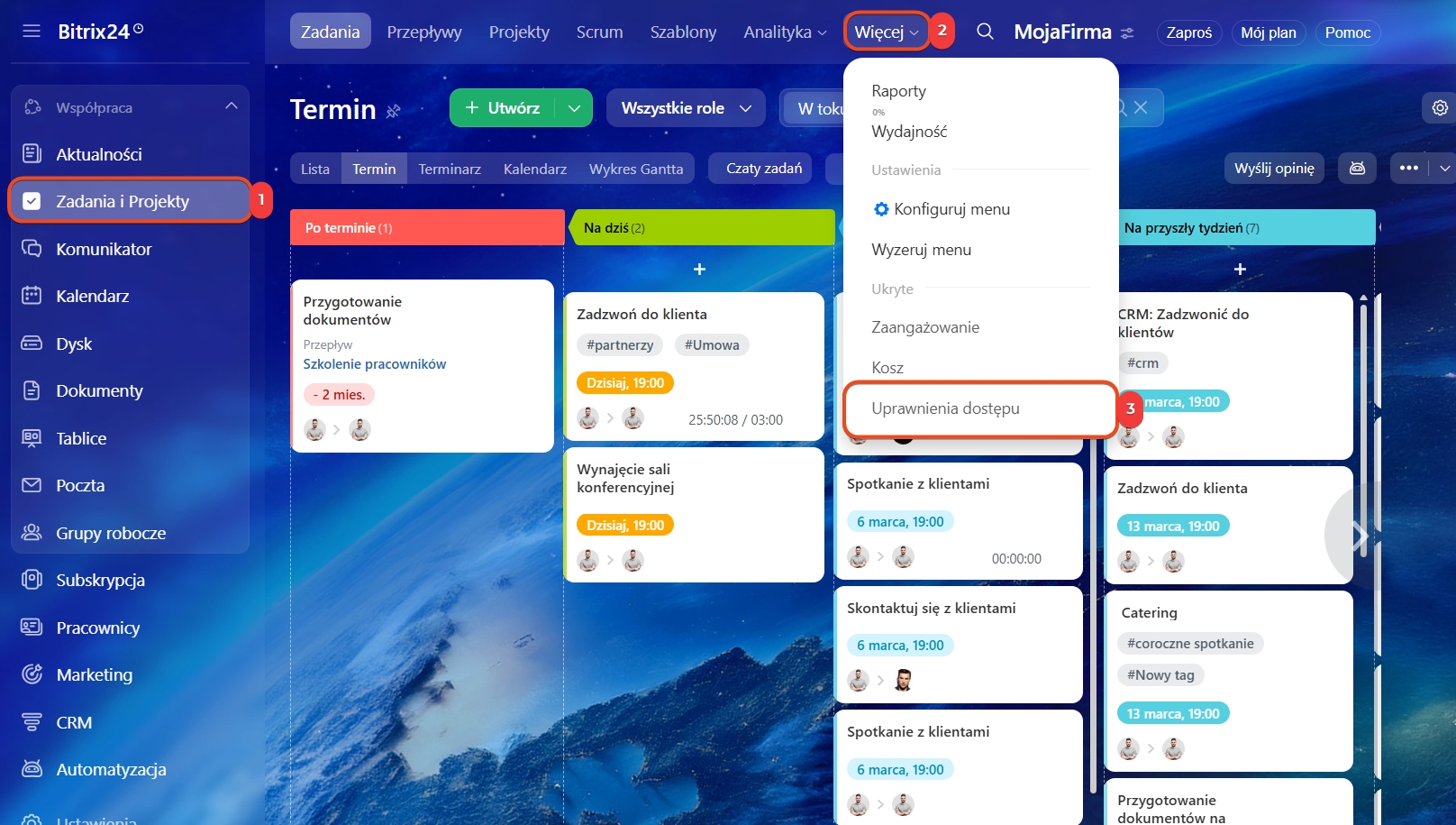 Domyślnie tylko administrator Bitrix24 może konfigurować uprawnienia, ale może przyznać tę możliwość innym pracownikom. Aby je ustawić, przejdź do: Zadania i projekty → Więcej → Uprawnienia dostępu.