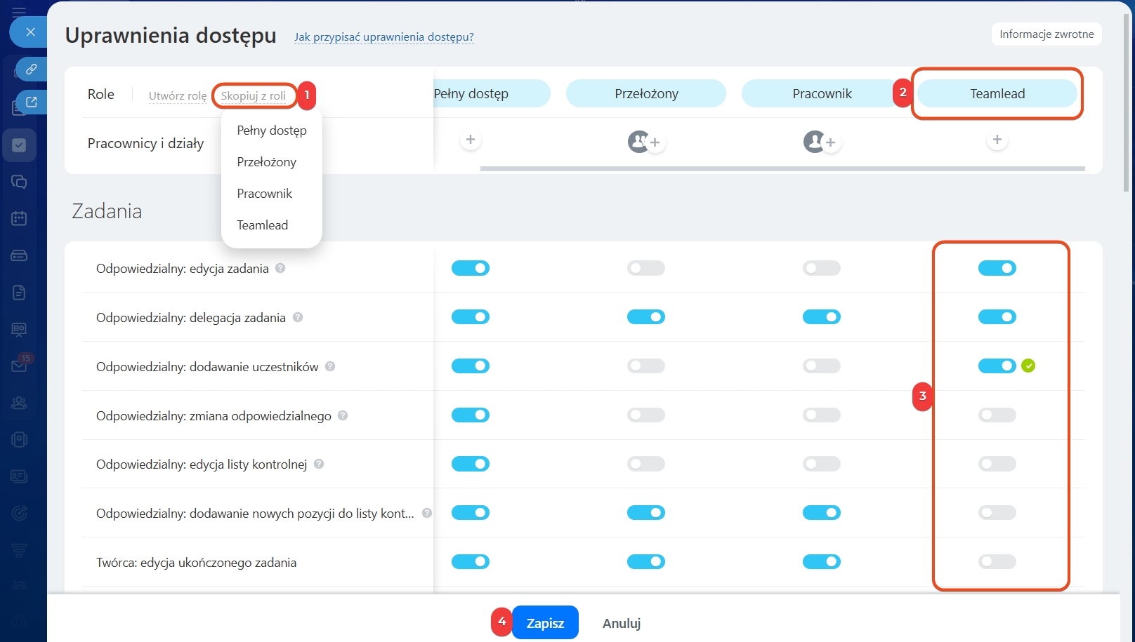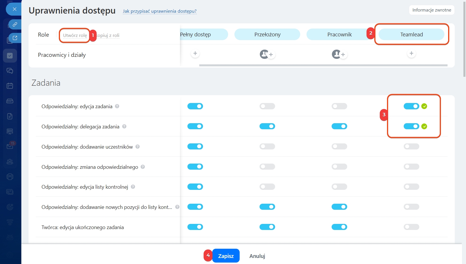 3–4. Dostosuj uprawnienia i kliknij Zapisz.