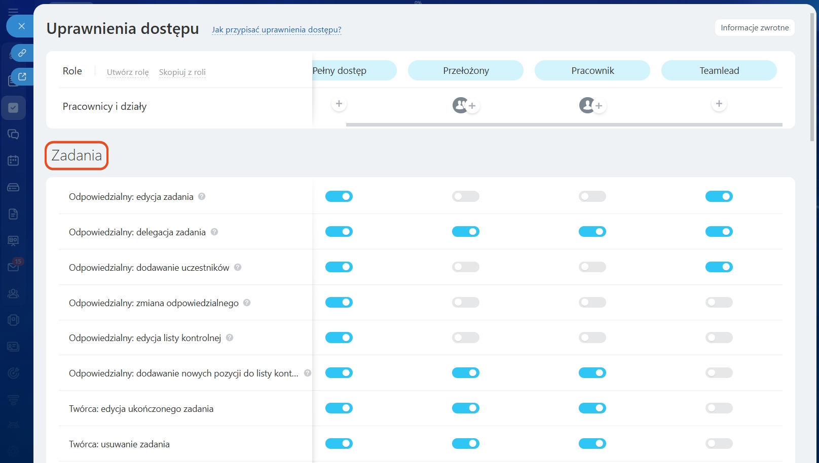 W ustawieniach każdej roli możesz określić prawa do różnych narzędzi w sekcji Zadania i projekty.