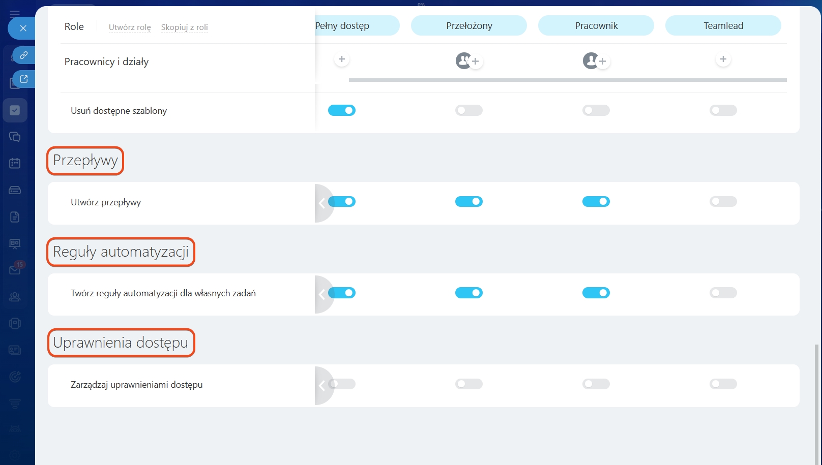 - Domyślnie w ustawieniach znajdują się trzy role: Pełny dostęp, Przełożony i Pracownik.
