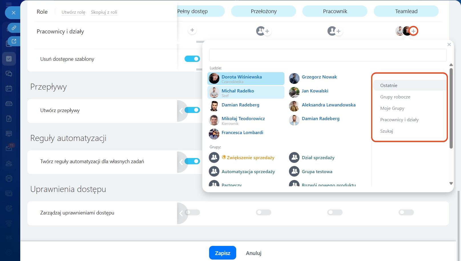 - Przełożony – rola automatycznie przypisywana kierownikom działów w strukturze firmy. Mogą oni zarządzać zadaniami swojego działu, ale nie mogą konfigurować ról ani uprawnień dostępu. Przełożeni zawsze widzą zadania swoich podwładnych – nawet gdy takie uprawnienie jest wyłączone w ustawieniach.