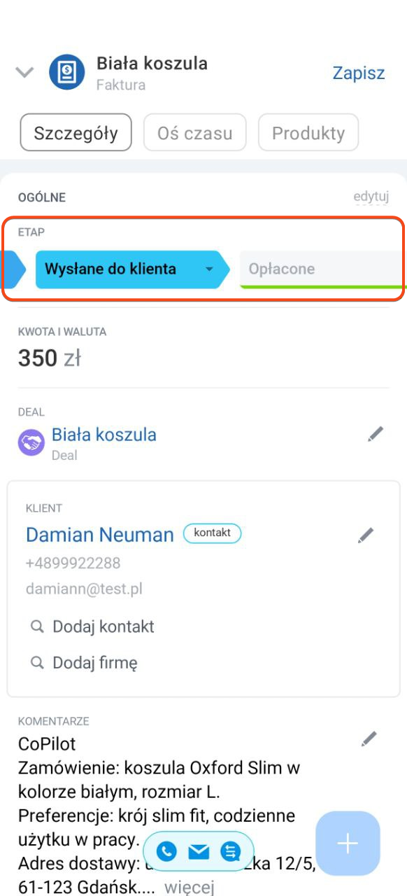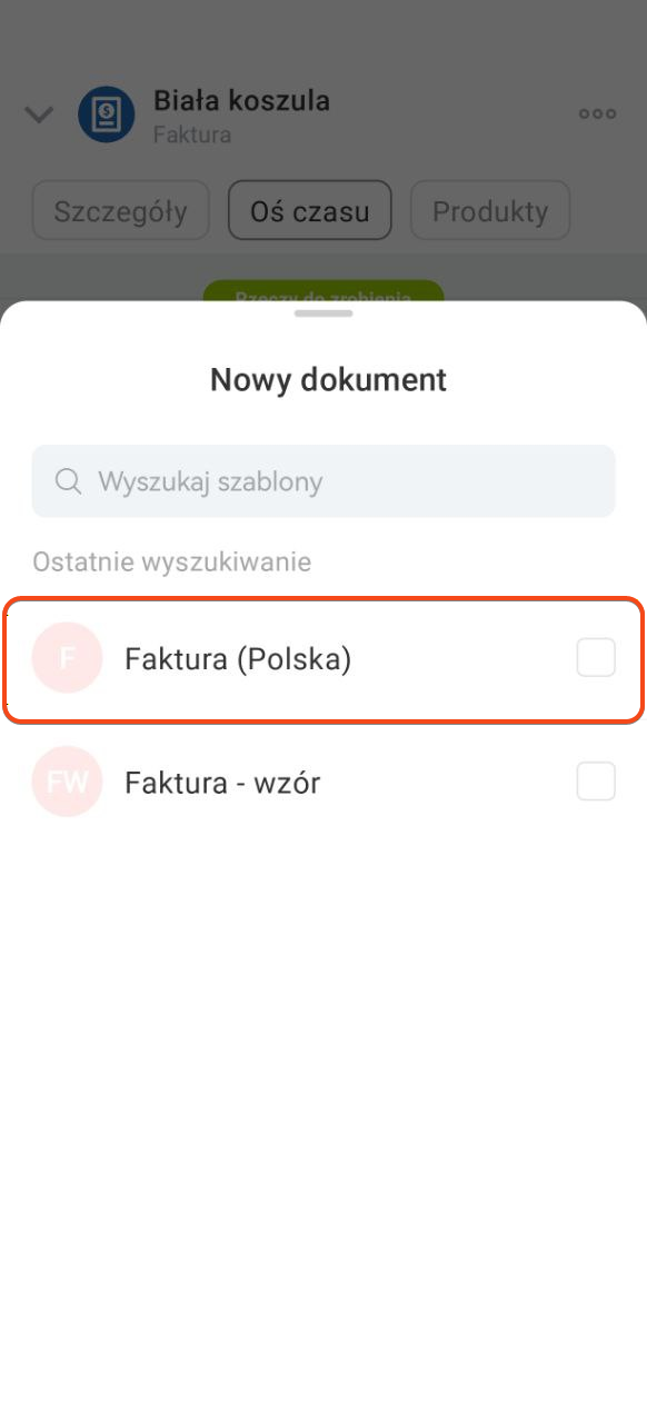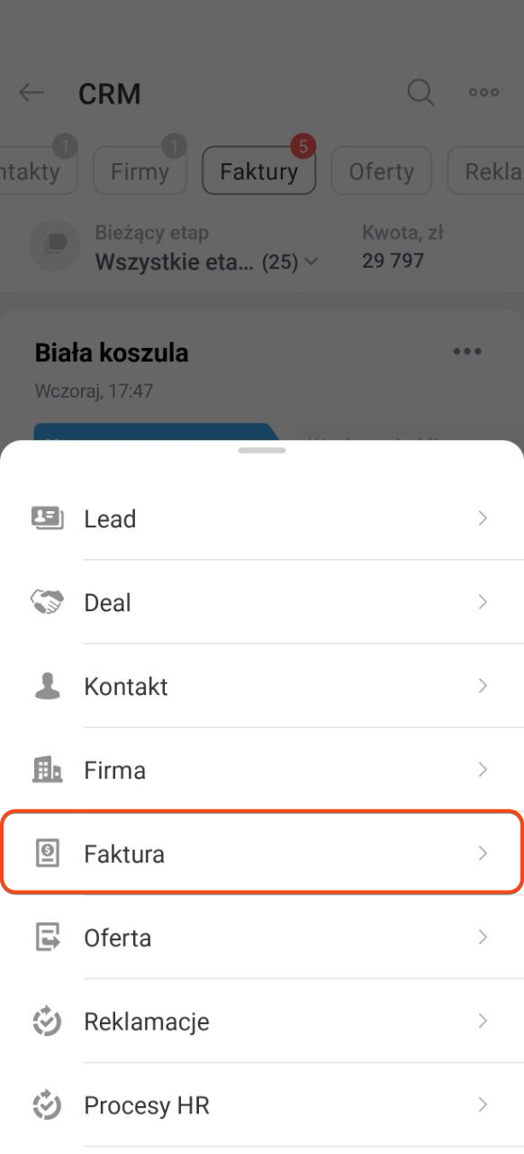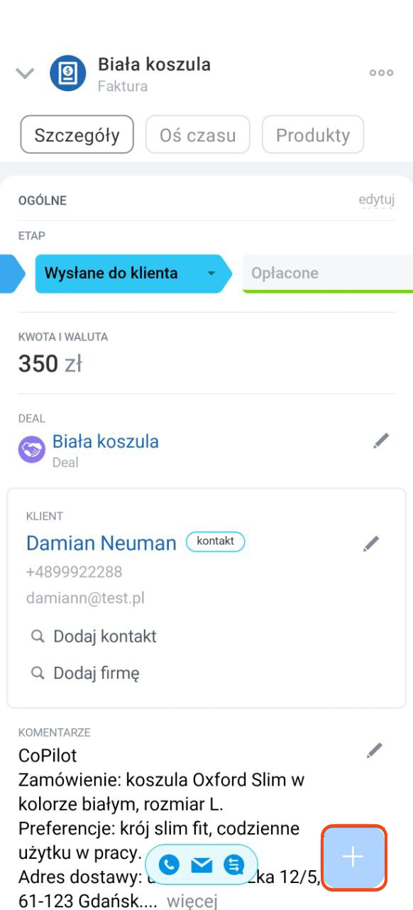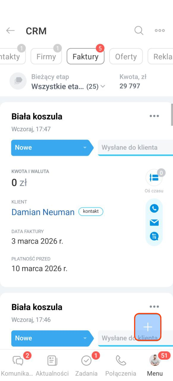 Fakturę możesz tworzyć i wysyłać bezpośrednio z mobilnej wersji CRM — dane wypełniają się automatycznie, bez ręcznego wpisywania.