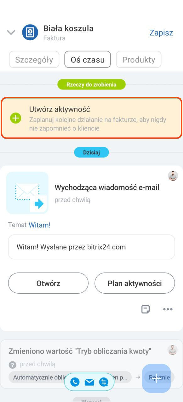 Aktywność możesz utworzyć bezpośrednio z osi czasu — kliknij Utwórz aktywność. Aktywności pomagają nie zapomnieć o kliencie, na przykład zaplanować rozmowę lub przygotowanie dokumentów.