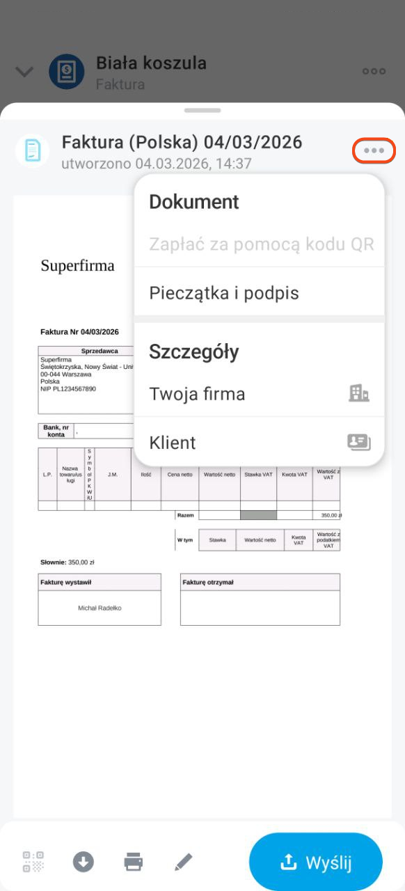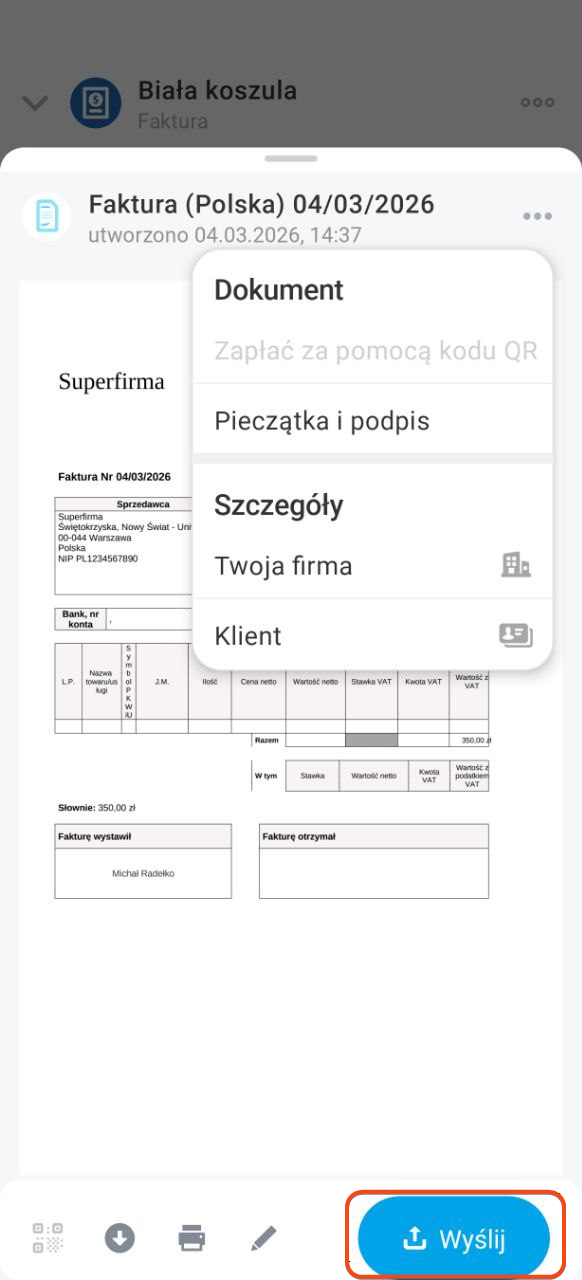 Aby wysłać dokument klientowi, kliknij Wyślij.