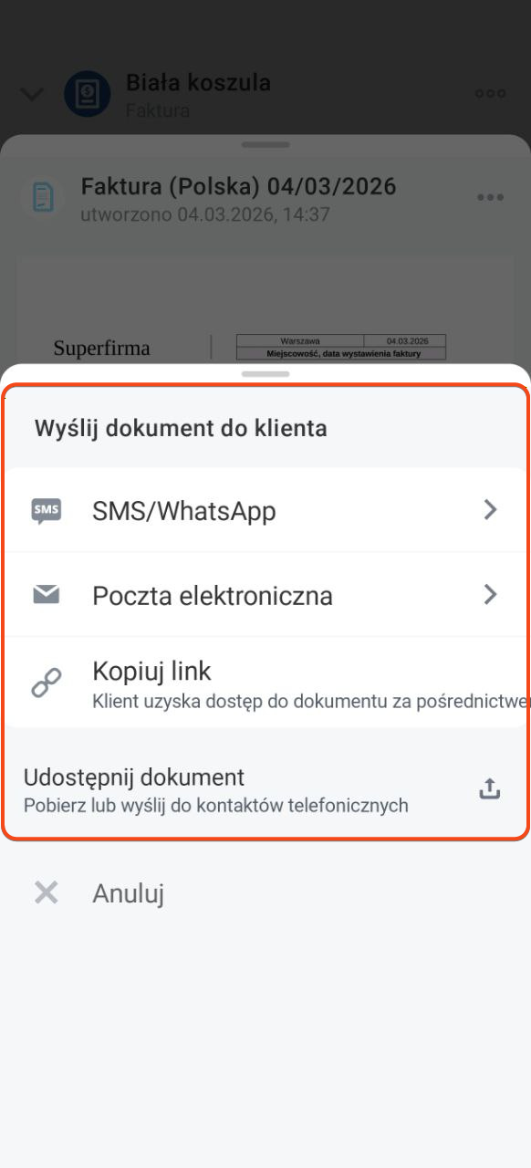 - Przez SMS — jeśli masz podłączonego operatora SMS i numer telefonu klienta. Klient otrzyma link do dokumentu.