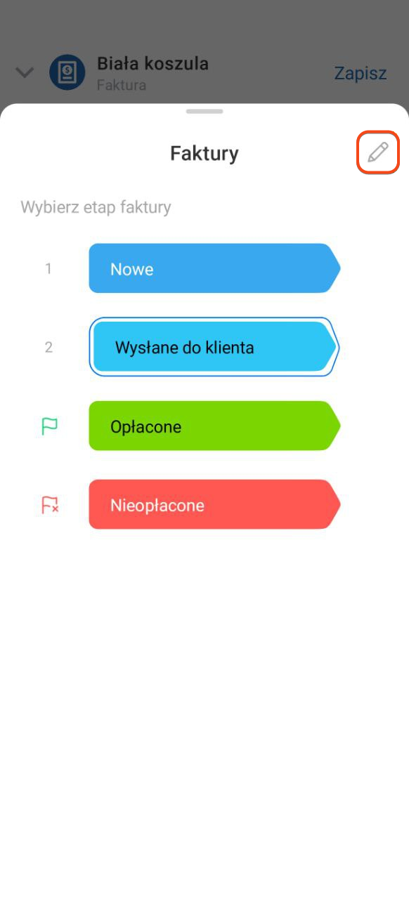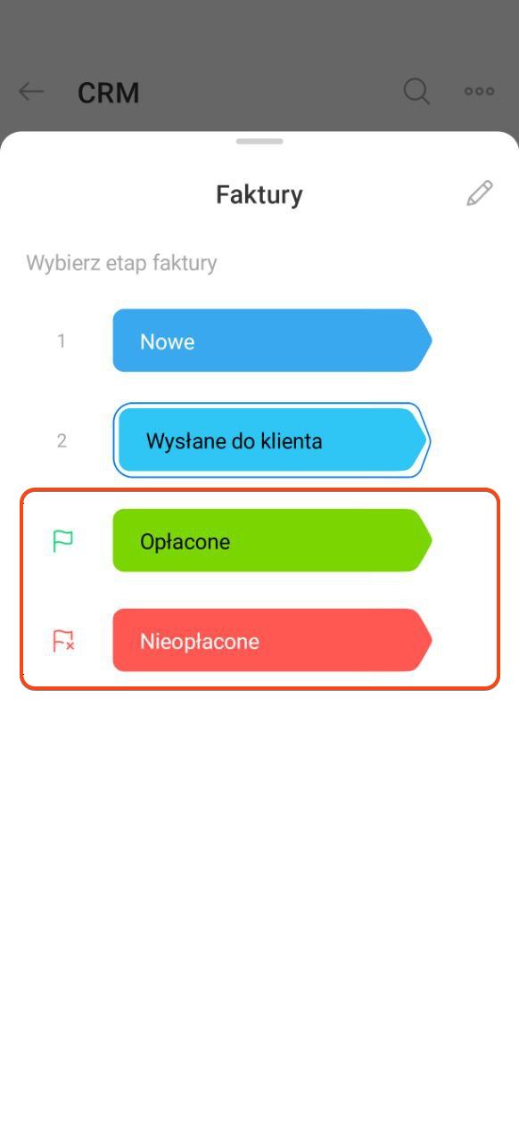 Gdy klient podejmie decyzję w sprawie faktury, przenieś fakturę na etap końcowy. Kliknij obecny etap i wybierz właściwy — na przykład Opłacone, jeśli klient uregulował płatność.