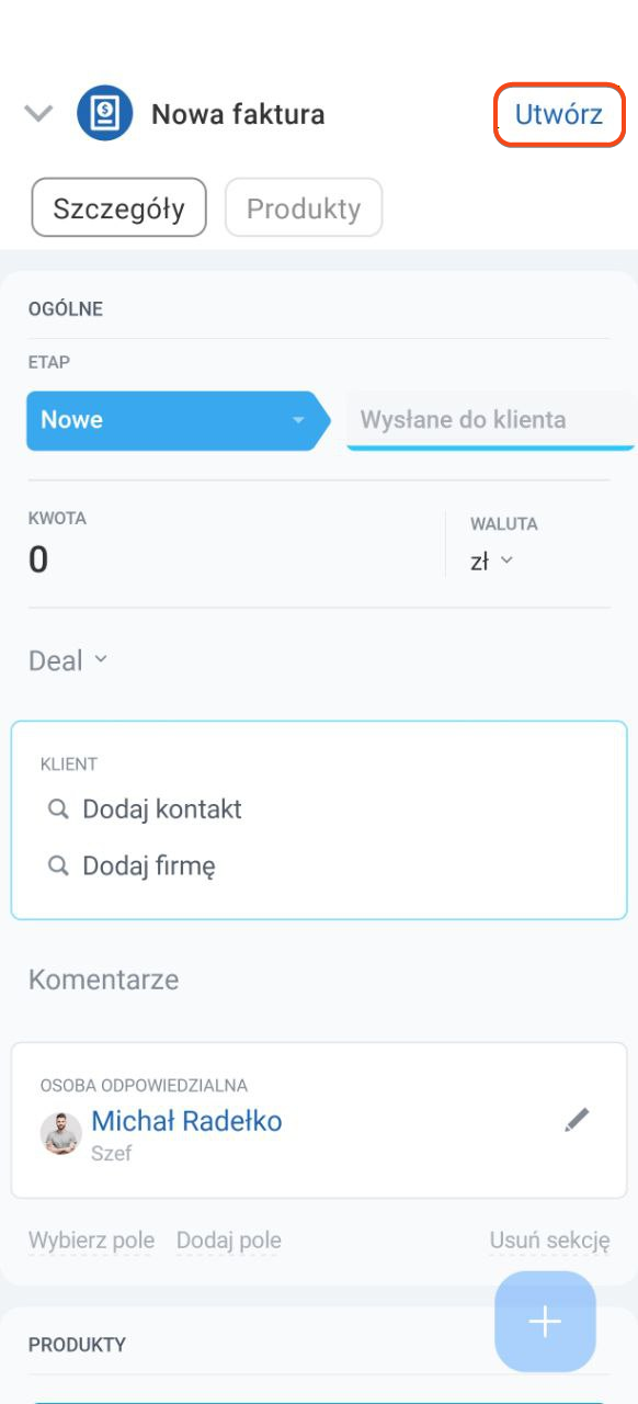 - Kwota i waluta — obliczą się automatycznie po dodaniu produktów.