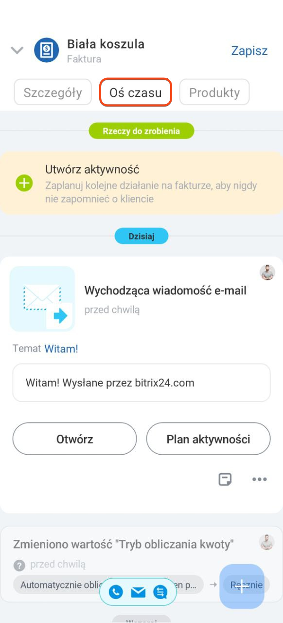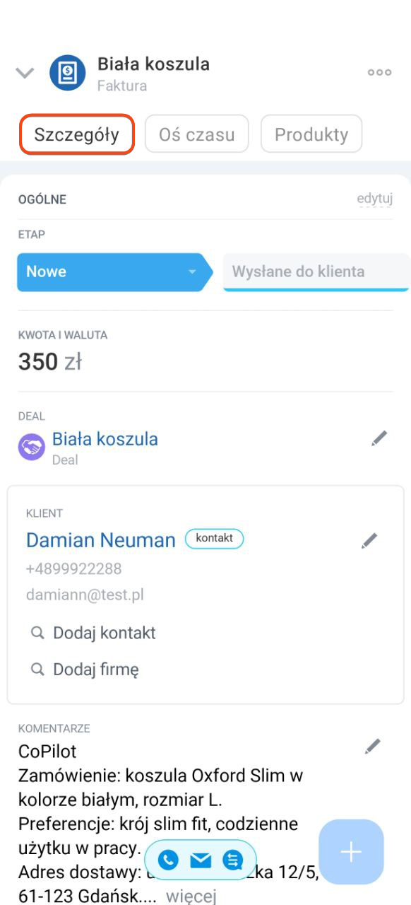 W formularzu znajdziesz trzy zakładki: Szczegóły, Oś czasu i Produkty.
