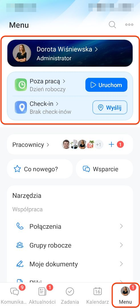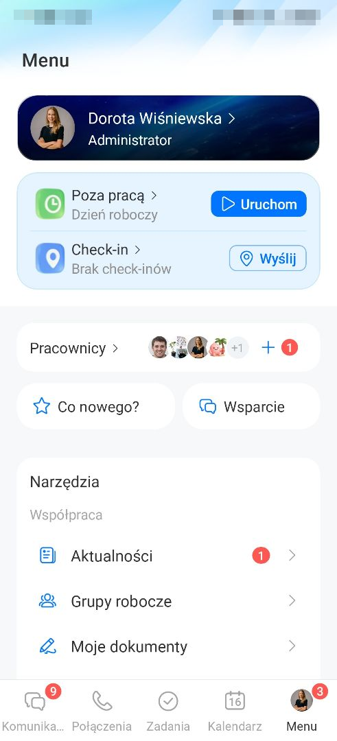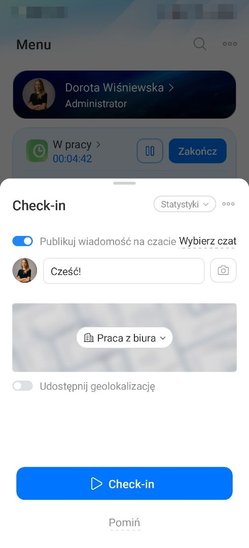 Check-in umożliwia odnotowanie początku dnia roboczego: podanie godziny, miejsca i dodanie zdjęcia. Informacja jest widoczna dla współpracowników i przełożonego — dzięki temu zespół wie, kto już jest na miejscu. Check-in służy do informowania zespołu i nie zastępuje ewidencji czasu pracy.