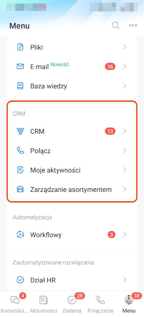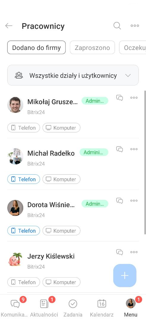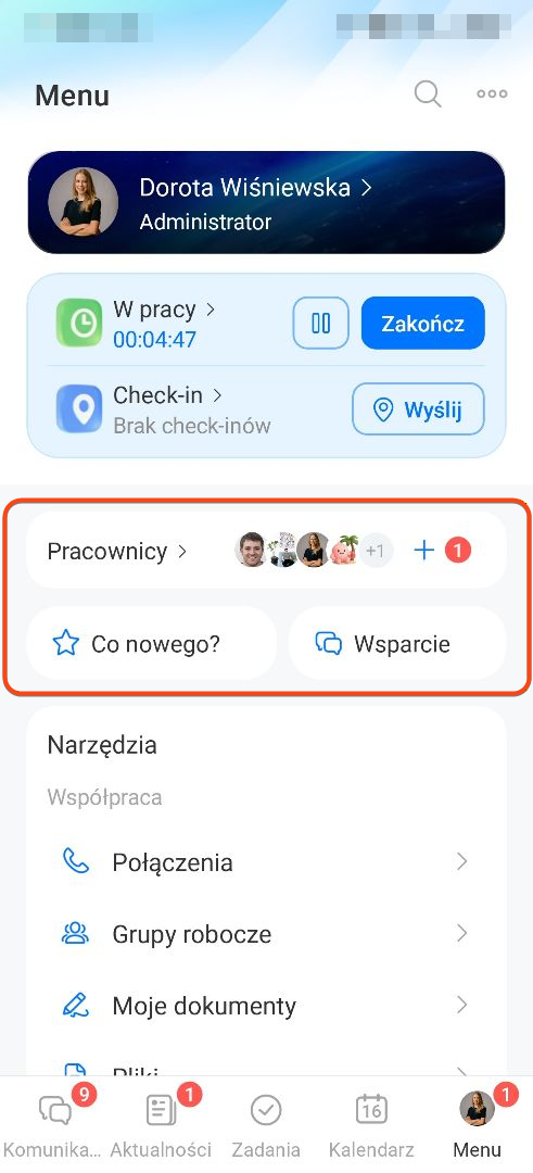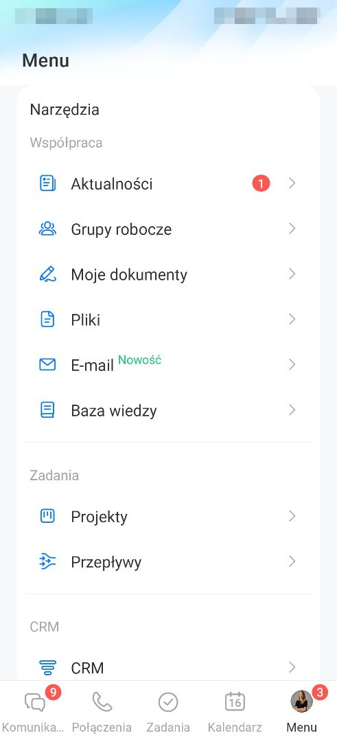 - W aplikacji mobilnej dostępne są: profil pracownika, sekcje Pracownicy i Wsparcie, Zadania i projekty, CRM, Komunikator i wiele innych.