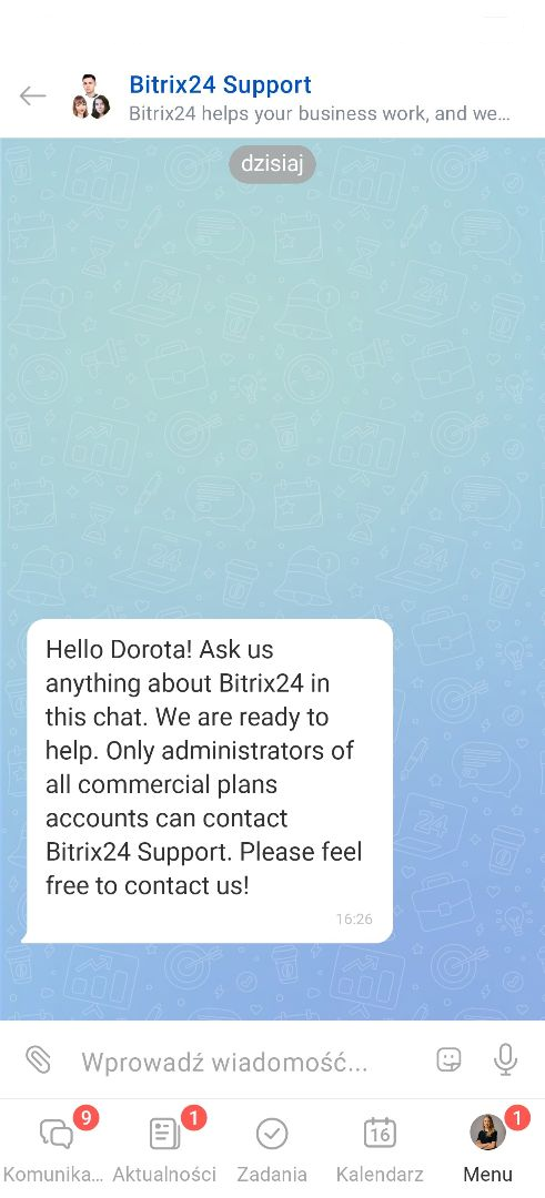Wsparcie. Jeśli masz pytania dotyczące pracy w Bitrix24, możesz napisać do Wsparcia i uzyskać pomoc na czacie.