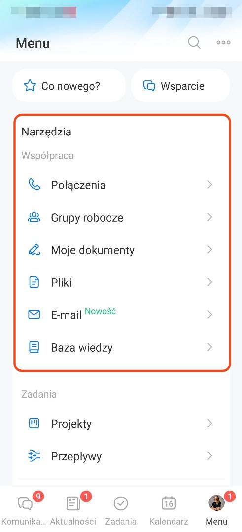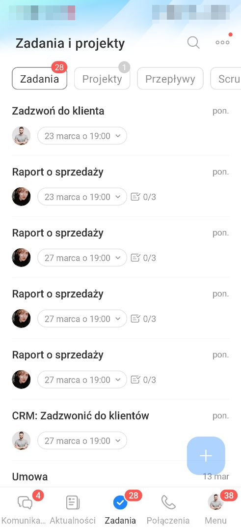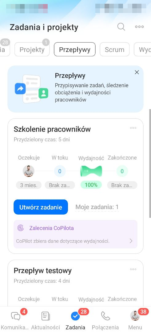 W tej sekcji tworzysz zadania, łączysz je w projekty i pracujesz w przepływach. Łatwo rozdzielasz pracę między pracownikami, śledzisz terminy i status realizacji oraz omawiasz szczegóły bezpośrednio w zadaniach. Dzięki temu masz pełną kontrolę nad procesami roboczymi nawet poza biurem.