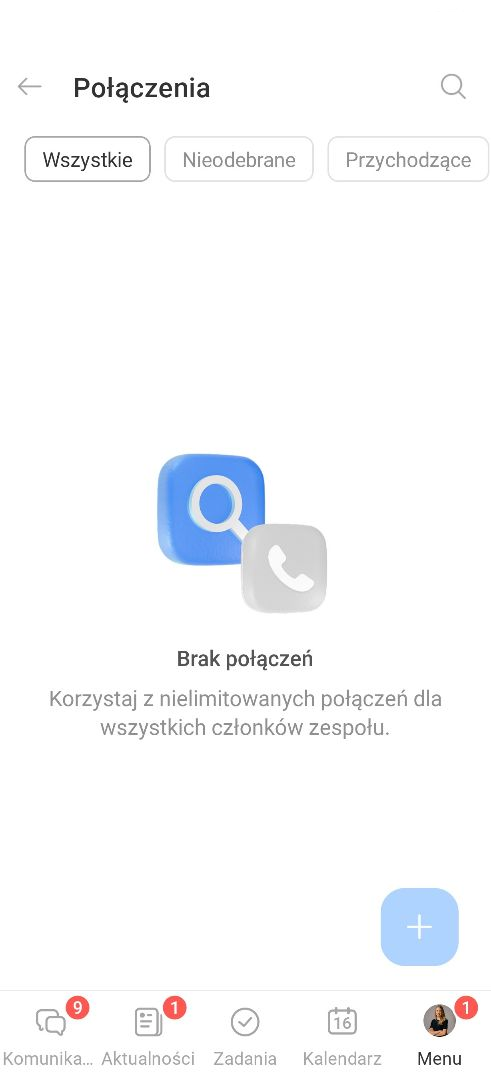 Połączenia. W tej sekcji wyświetla się historia połączeń między pracownikami — pogrupowana na zakładkach Wszystkie, Nieodebrane, Przychodzące oraz Wychodzące. Dzięki takiej segregacji łatwo odnajdziesz potrzebne rozmowy i w razie potrzeby oddzwonisz do współpracownika. Szukać można po nazwie pracownika lub nazwie czatu.