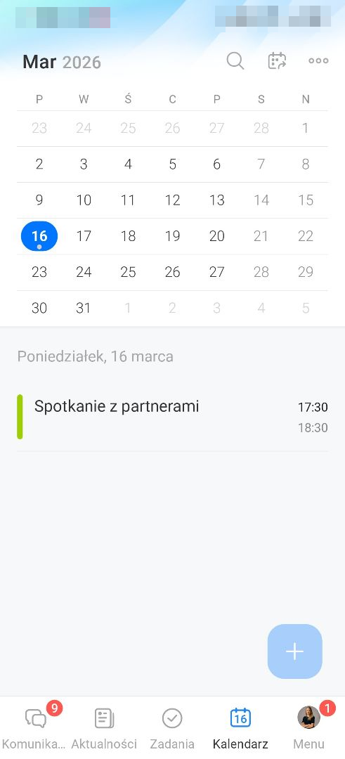 Kalendarz pozwala planować osobiste wydarzenia i spotkania ze współpracownikami bezpośrednio w aplikacji mobilnej. Twórz wydarzenia, zapraszaj uczestników i proponuj wolne terminy.