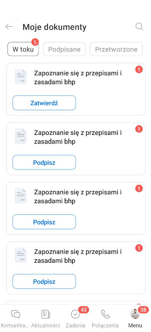 Moje dokumenty — sekcja do pracy z dokumentami kadrowymi: wysyłania ich do podpisu, podpisywania, śledzenia statusu podpisywania, przeglądania i pobierania.