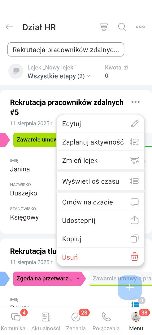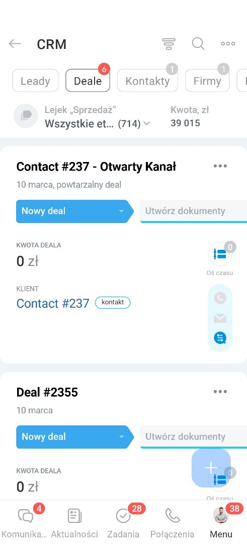CRM. W mobilnym CRM pracujesz tak samo jak na komputerze. Na przykład tworzysz i edytujesz deale, przypisujesz odpowiedzialnych, zmieniasz etapy, planujesz aktywności w CRM, wystawiasz faktury i przyjmujesz płatności.
