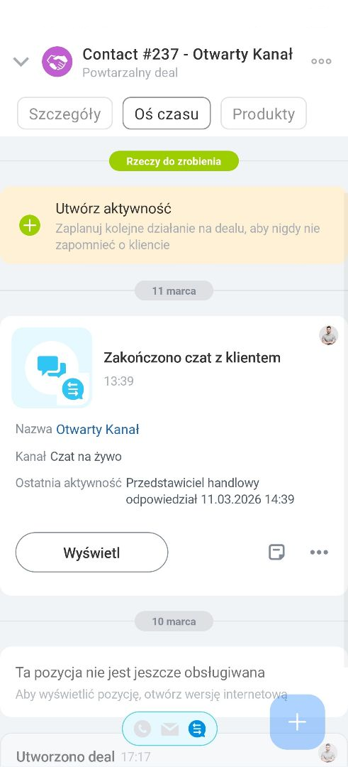 Cała historia kontaktów z klientem widoczna jest na osi czasu w formularzu, dzięki czemu masz pełny obraz każdego leadu lub deala.
