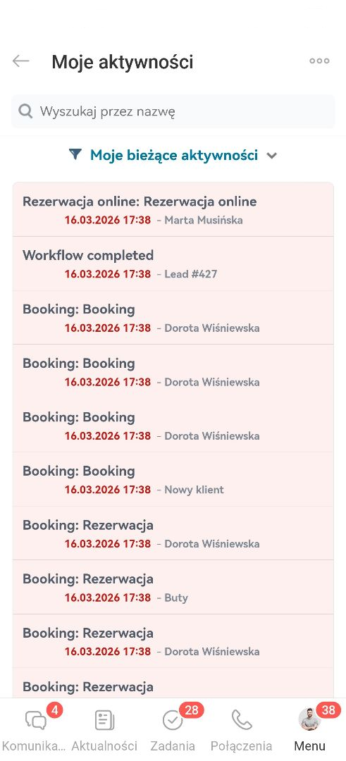 Moje Aktywności w CRM — sekcja pokazująca wszystkie zaplanowane i zakończone aktywności: połączenia, spotkania, zadania i inne działania wobec klientów. Szybko filtrujesz aktywności i przechodzisz do formularza deala, zadania lub e-maila.