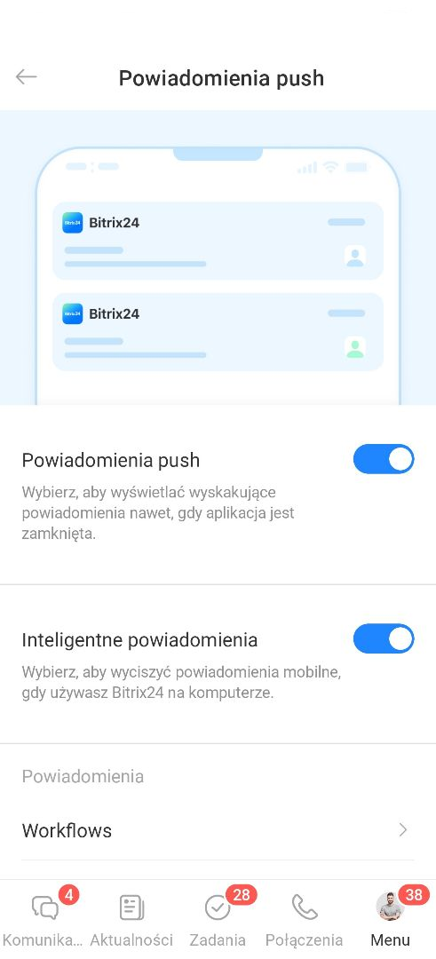 Powiadomienia. Możesz zdecydować, które powiadomienia chcesz otrzymywać w aplikacji mobilnej. Na przykład włącz Inteligentny tryb, aby nie dostawać powiadomień na telefon, gdy pracujesz w Bitrix24 na komputerze.