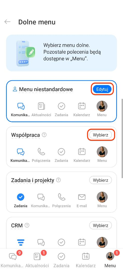 Skonfiguruj szybki dostęp do narzędzi: dodaj do dolnego menu sekcje, z których korzystasz najczęściej. Wybierz jeden z gotowych wariantów albo stwórz własne menu. Wybrane sekcje będą dostępne z każdego miejsca w aplikacji, pozostałe znajdziesz w menu ogólnym.