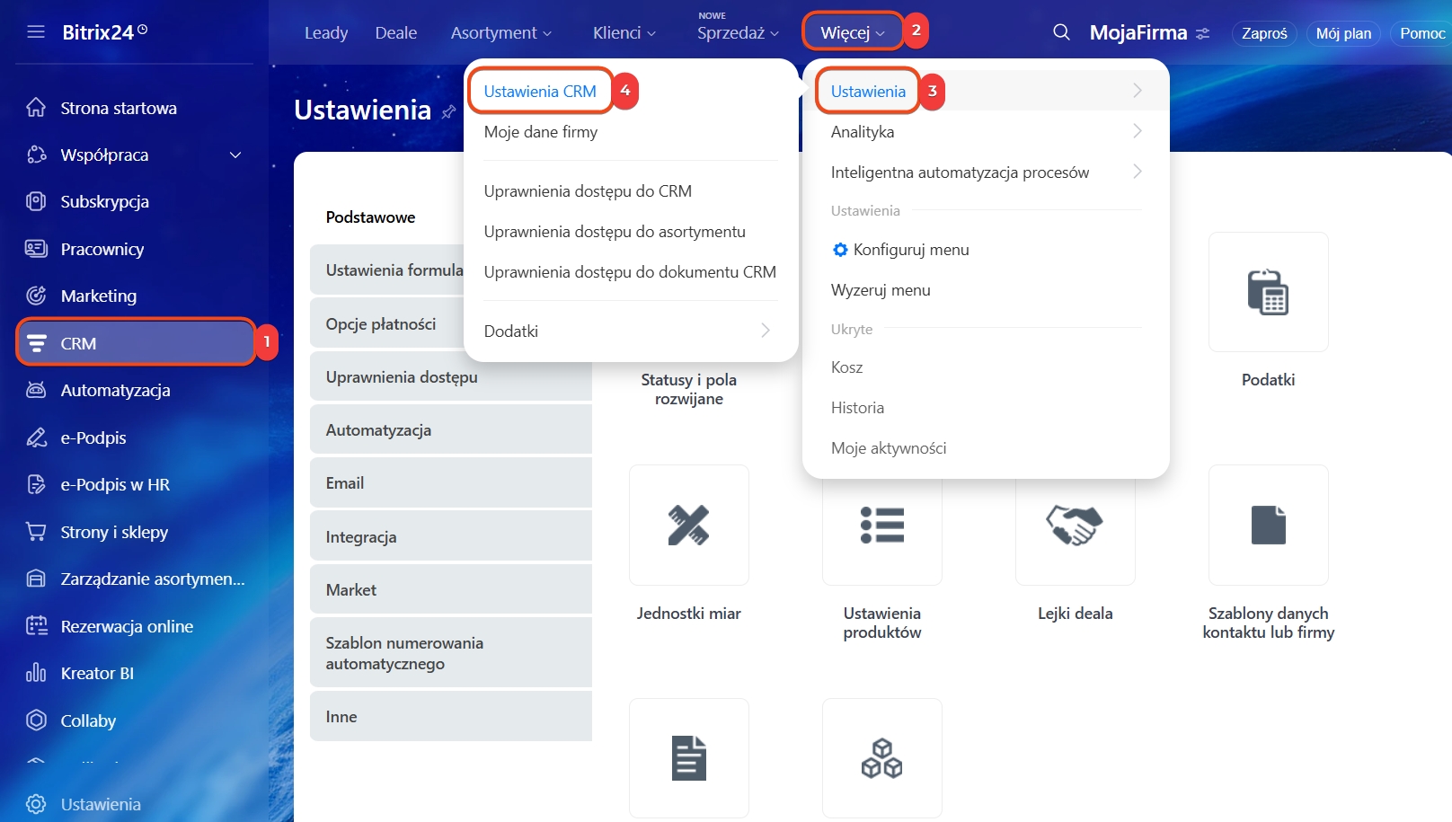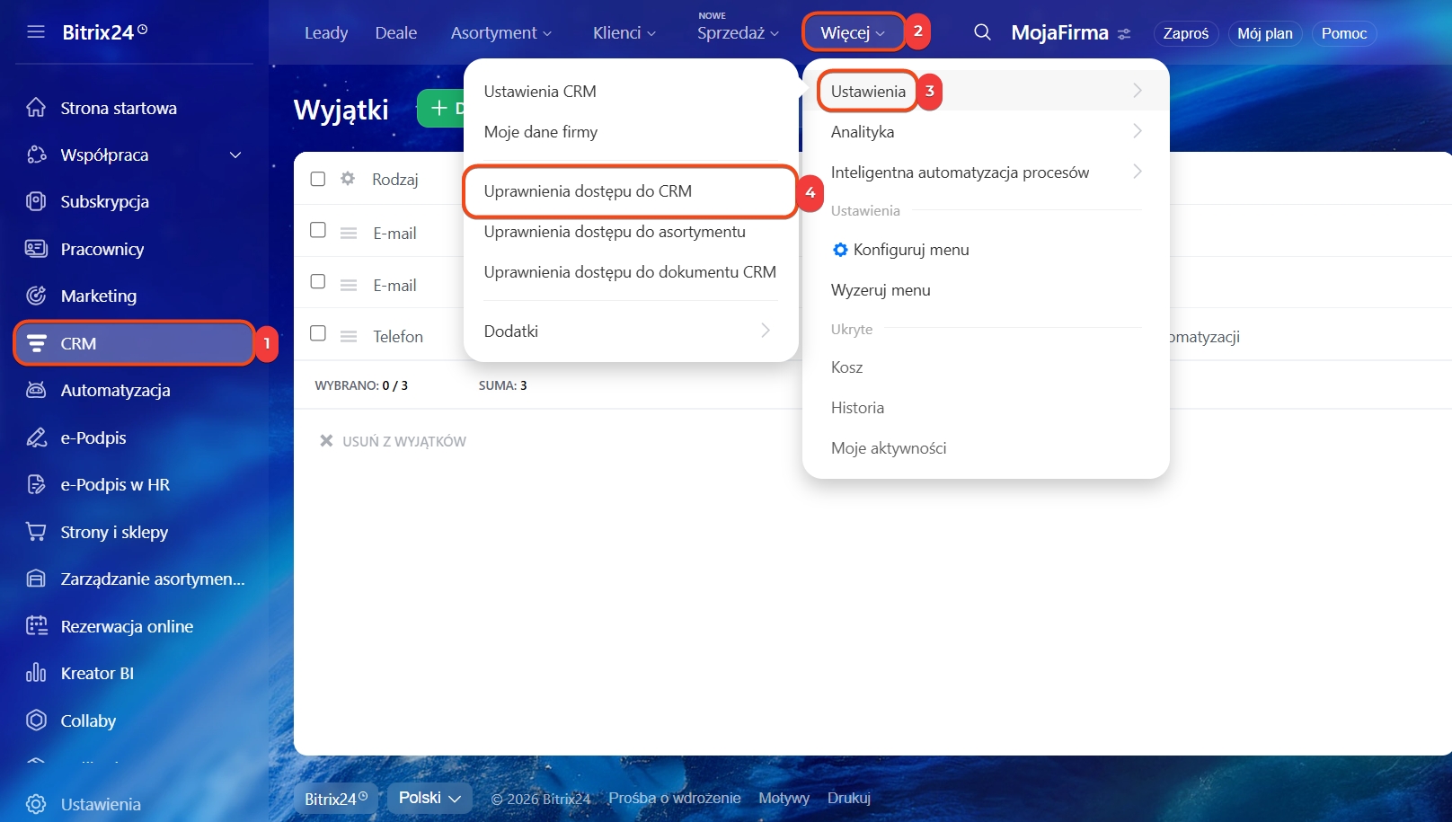 1–4. Przejdź do CRM > Więcej > Ustawienia > Uprawnieniе dostępu do CRM.