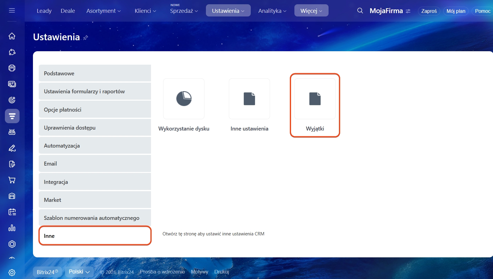 Problem. Jeśli w sekcji CRM > Więcej > Ustawienia > Ustawienia CRM widzisz tylko opcje Poczta i Inne, oznacza to, że nie masz uprawnień do konfiguracji CRM.