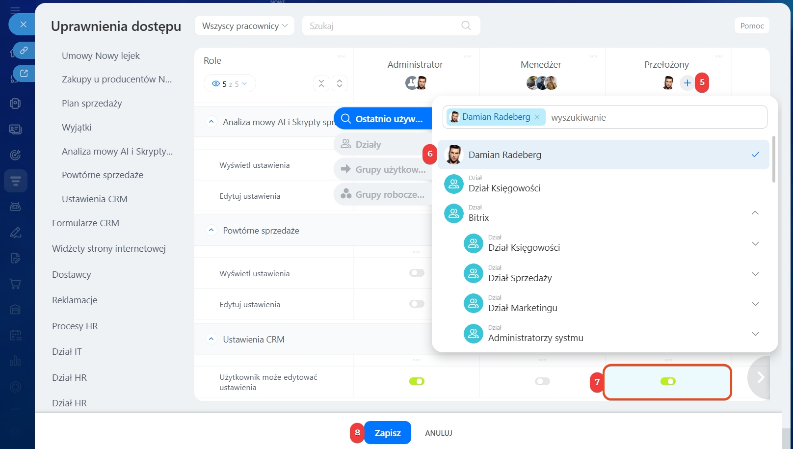 8–9. Zapisz zmiany. Pracownik uzyska dostęp do ustawień CRM.