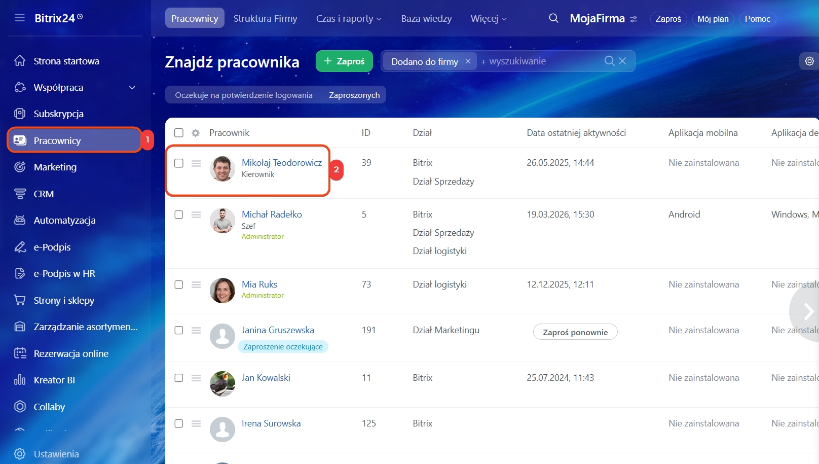 1–2. Przejdź do sekcji Pracownicy i otwórz profil wybranego użytkownika.
