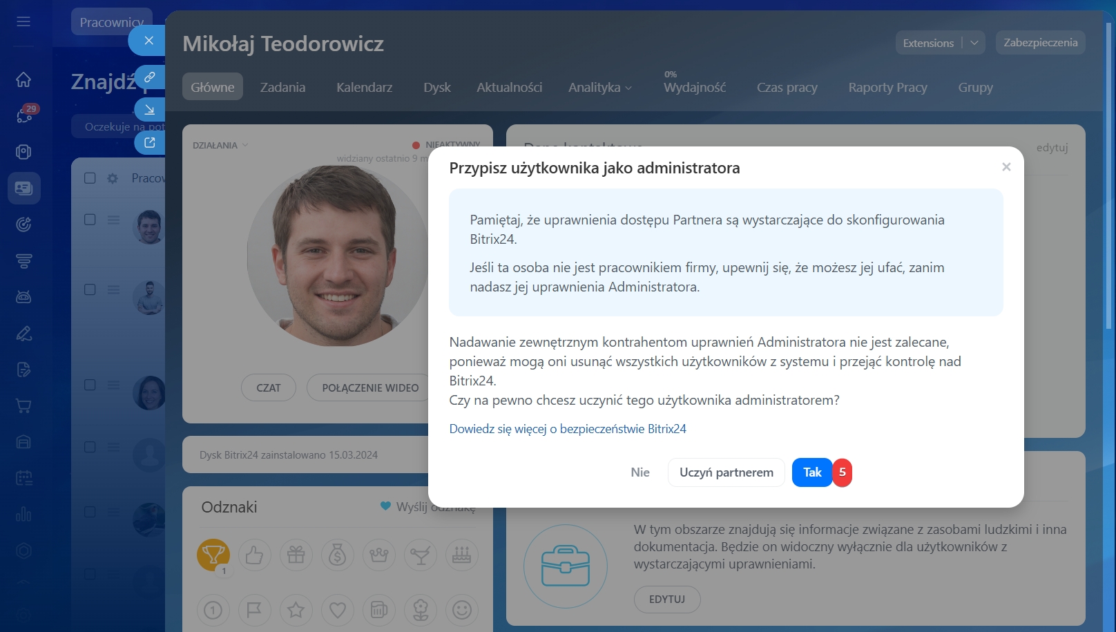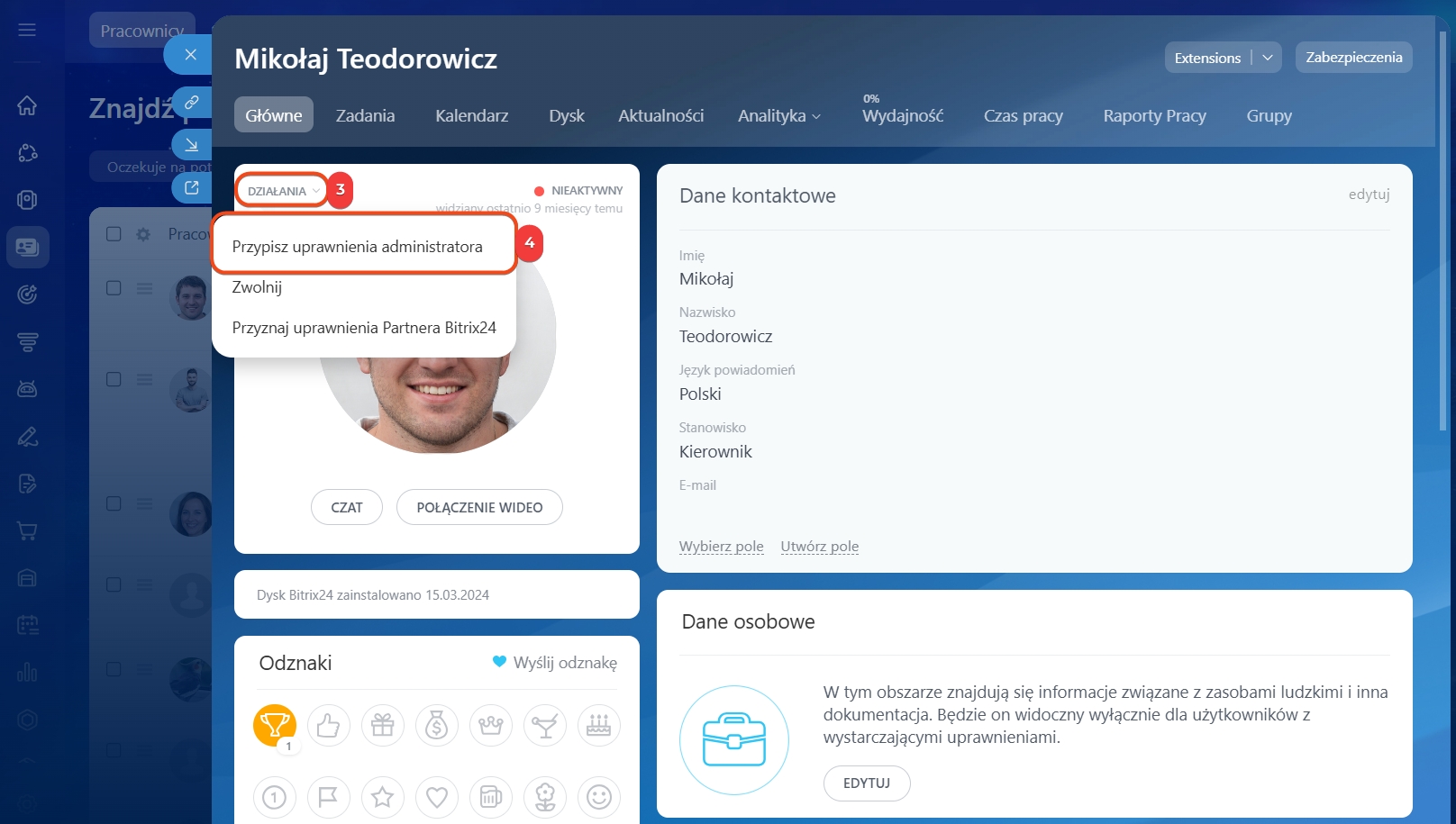 Nadaj rolę administratora Bitrix24. To rozwiązanie sprawdzi się, jeśli pracownik potrzebuje pełnego dostępu do ustawień Bitrix24: uprawnień innych pracowników, CRM, workflow i innych narzędzi.