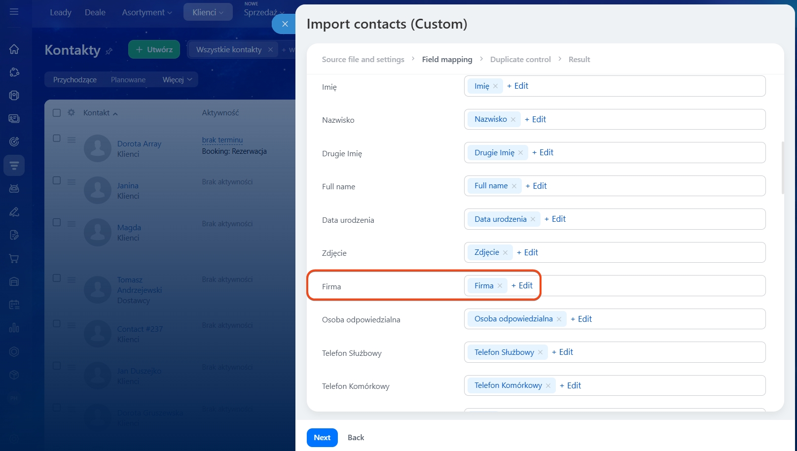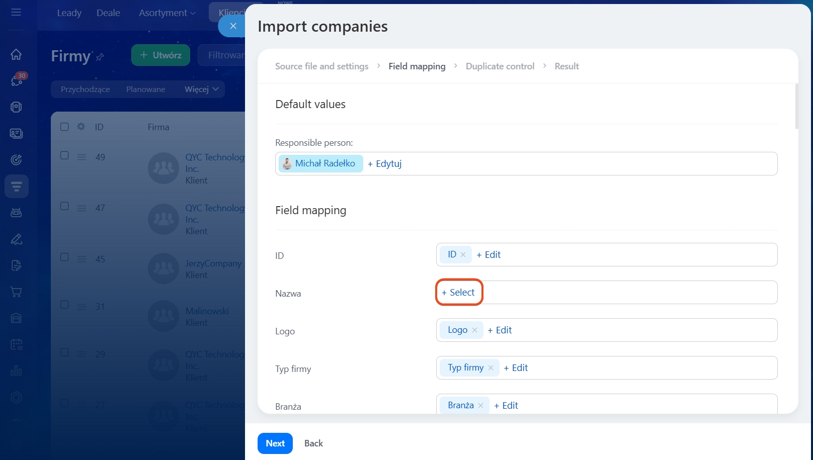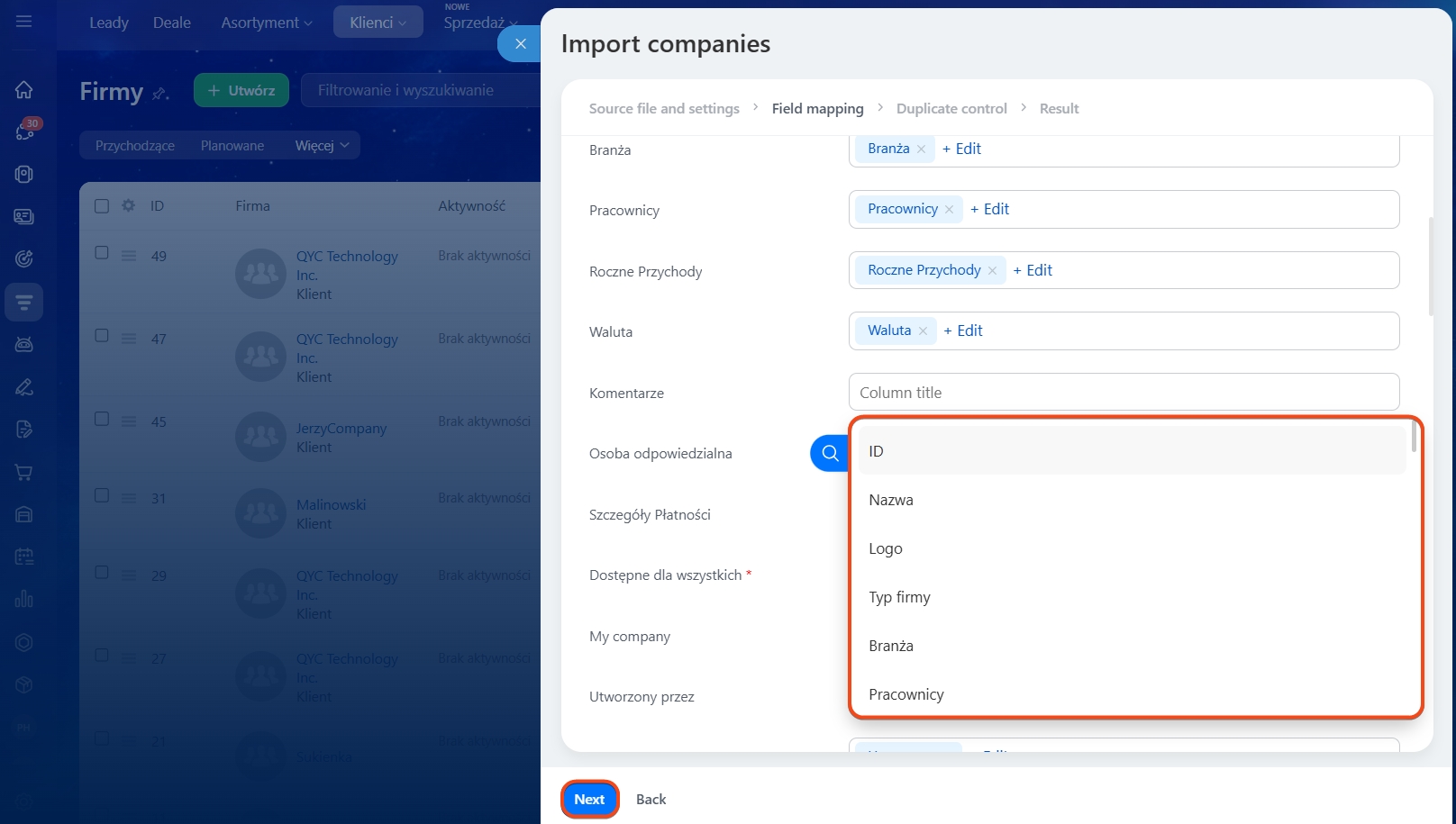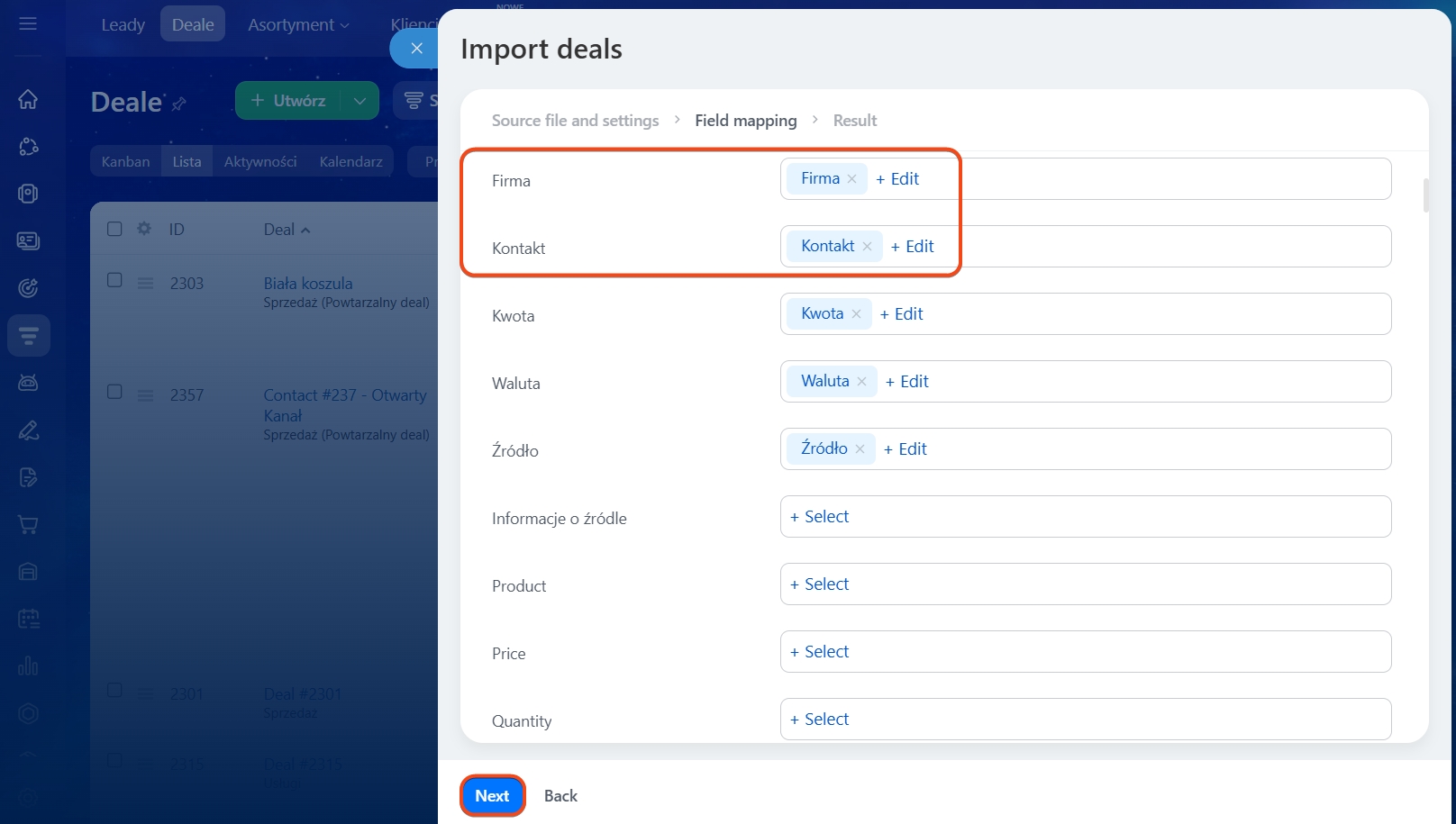Sprawdź mapowanie pól. Na przykład dane z pola Firma w pliku powinny trafić do pola Firma w formularzu elementu CRM.