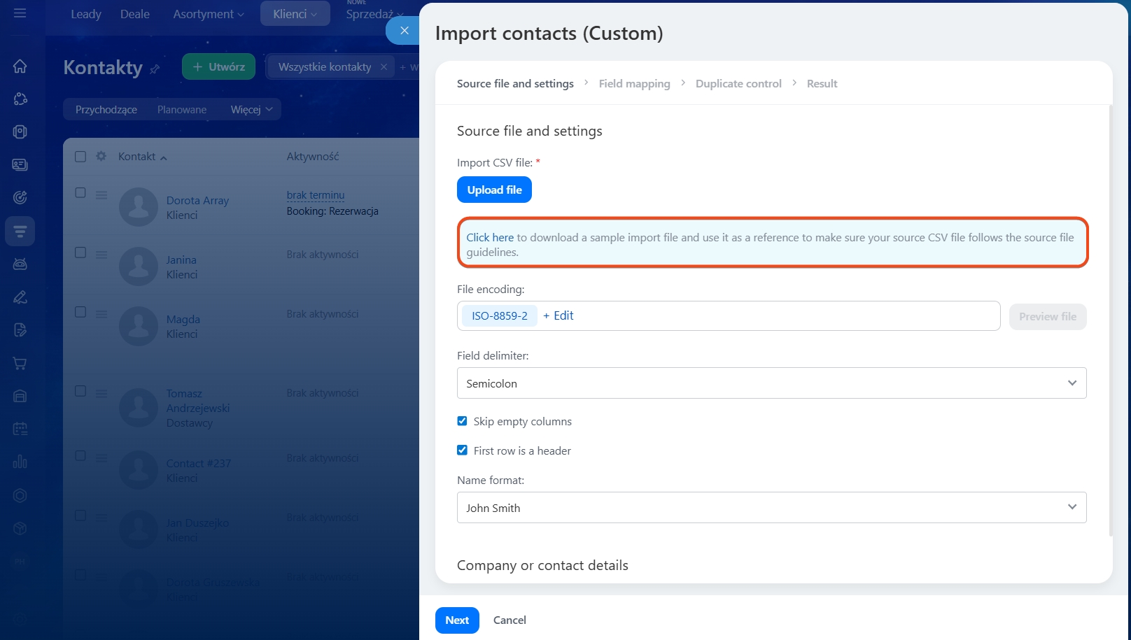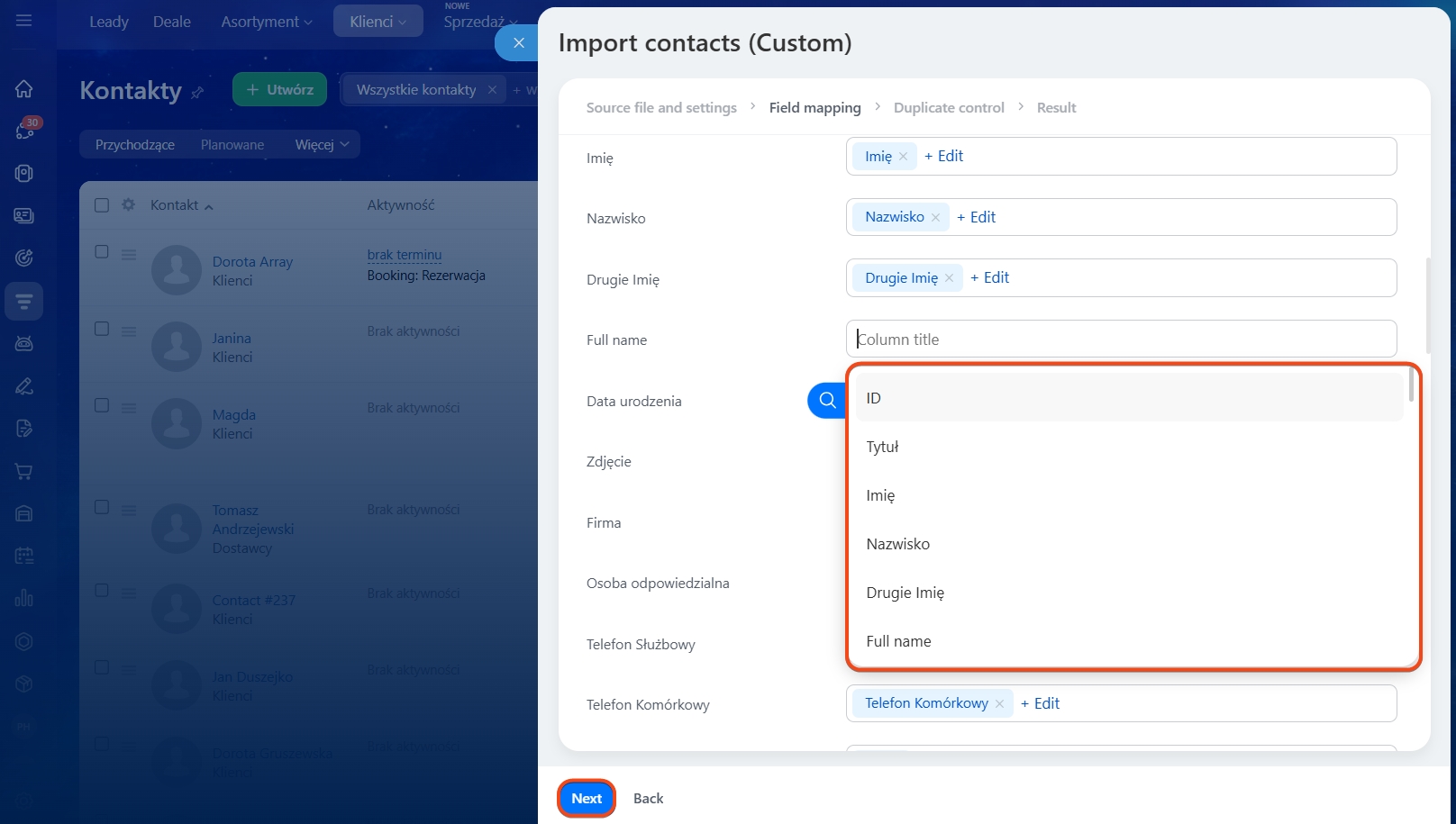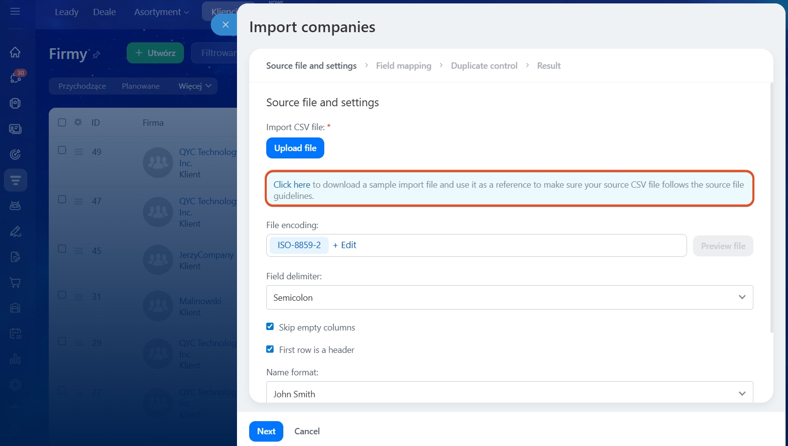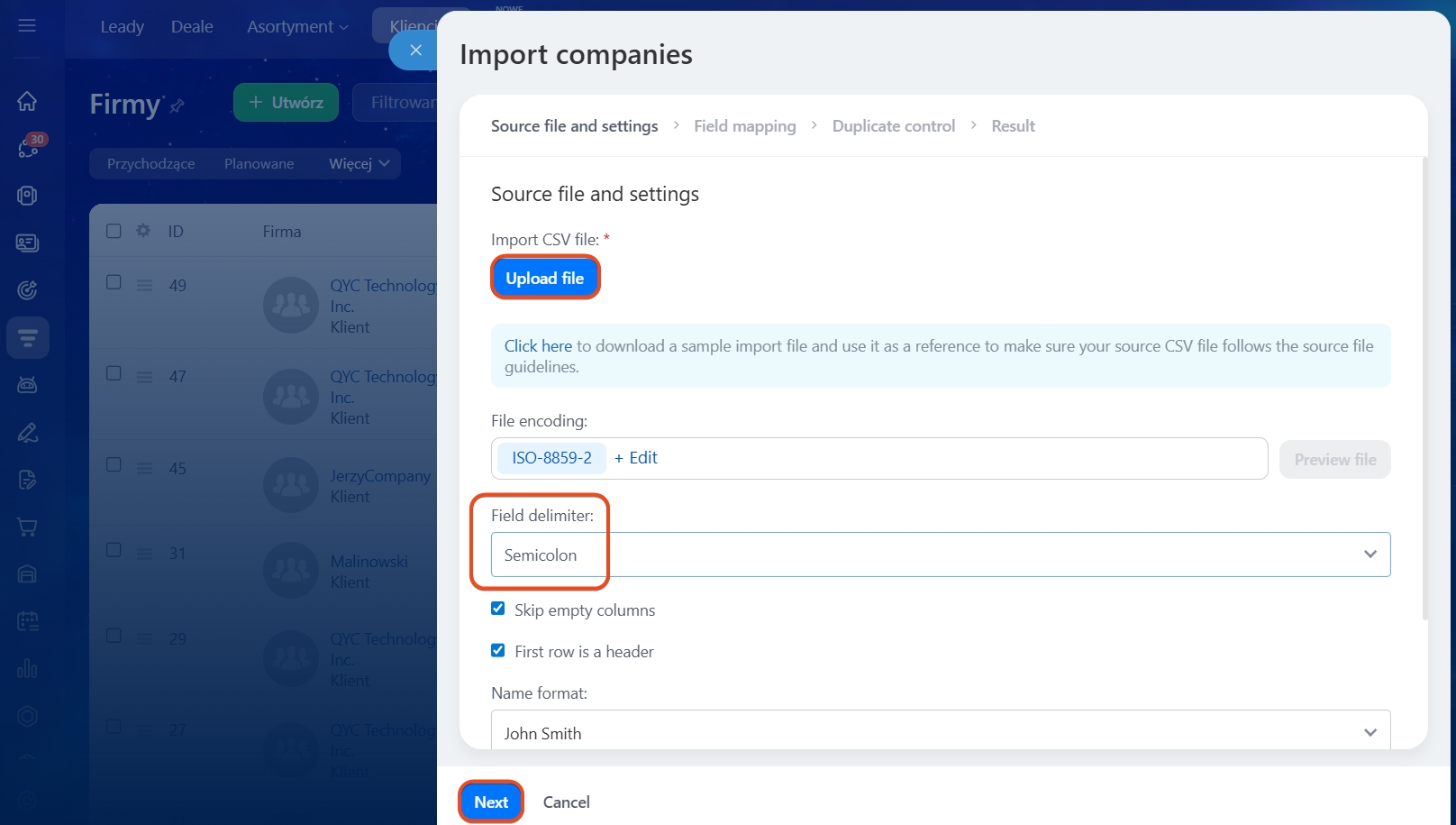 Sprawdź mapowanie pól. Na przykład dane z pola Firma w pliku powinny trafić do pola Firma w formularzu elementu CRM.