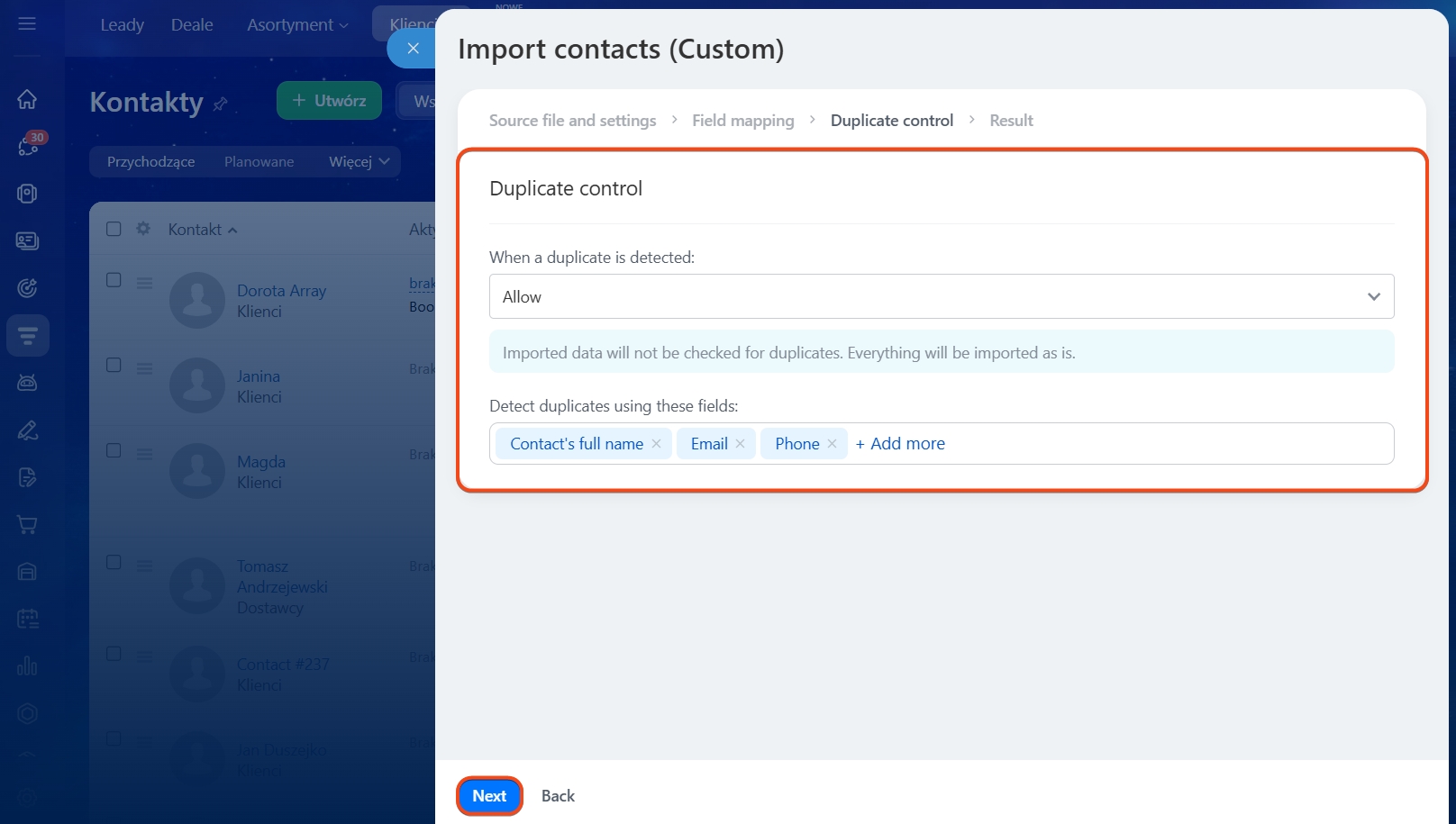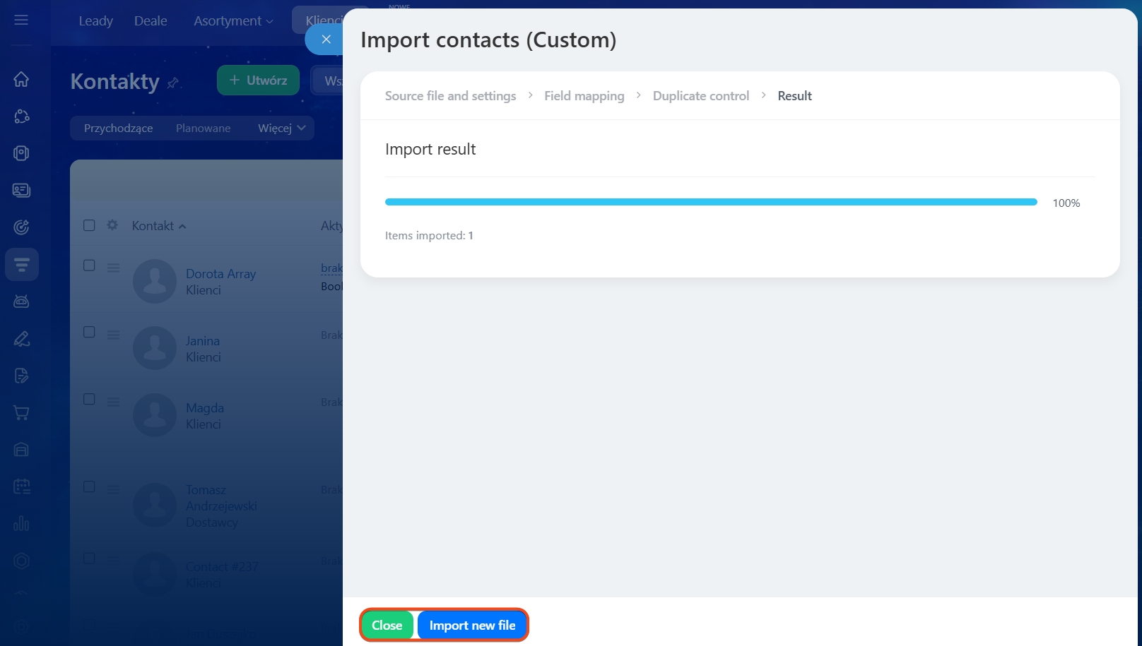 Wybierz sposób obsługi duplikatów i zakończ import. Jeśli chcesz wgrać kolejny plik, kliknij Zacznij od nowa. Formularze kontaktów pojawią się w sekcji CRM > Klienci > Kontakty.