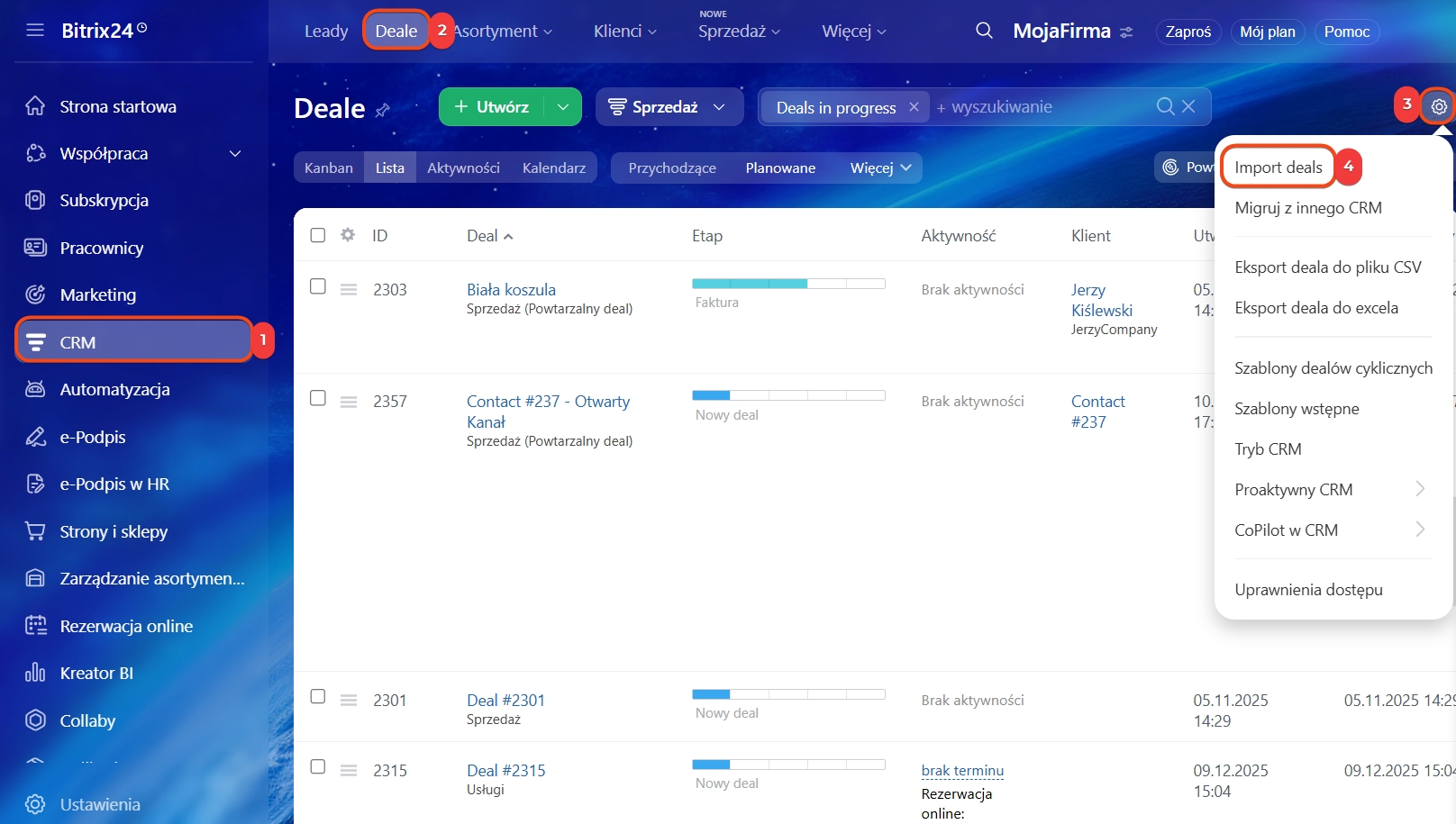 Przejdź do CRM > Deale. Kliknij Ustawienia (⚙️) po prawej stronie i wybierz Import deali.