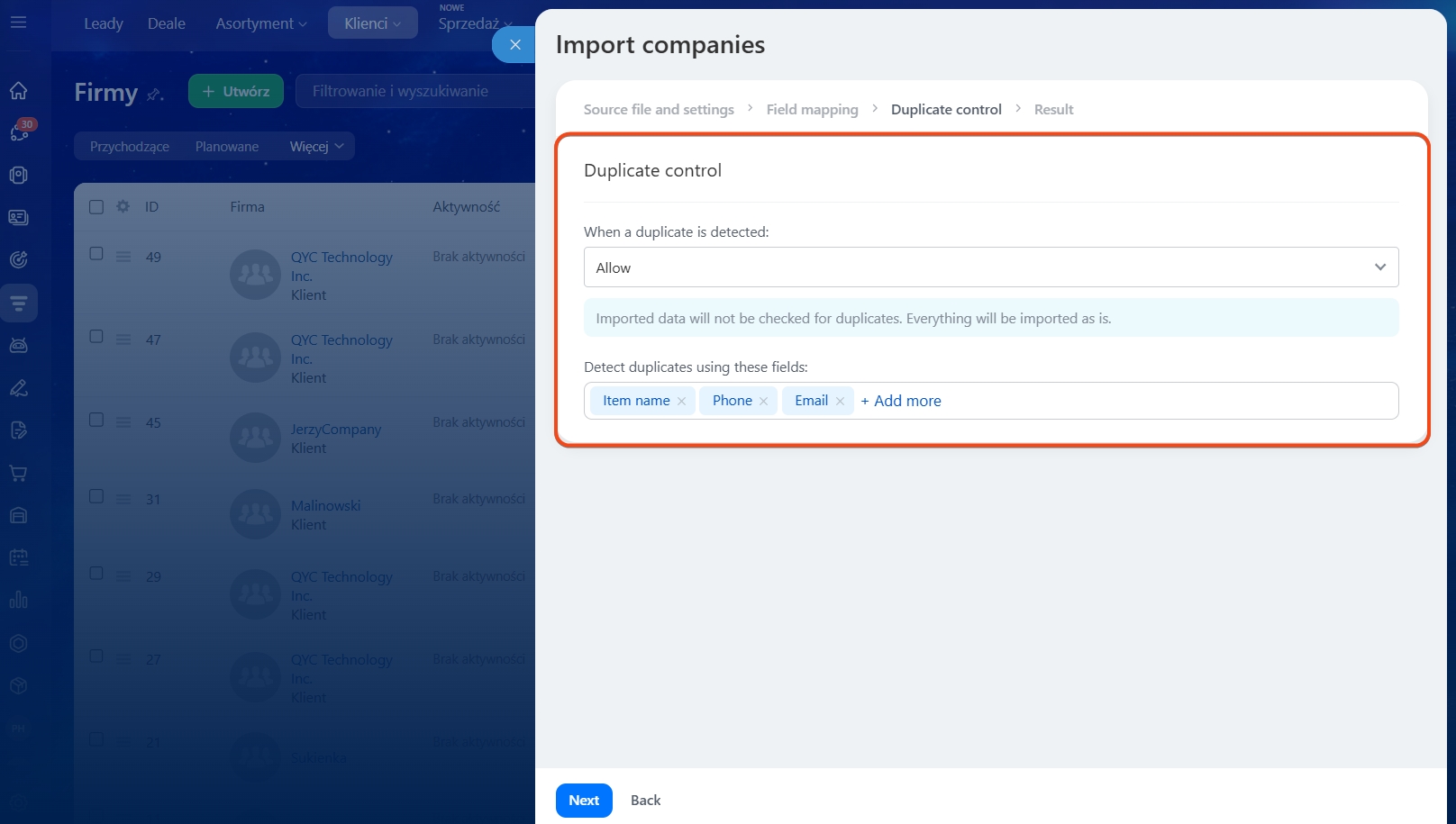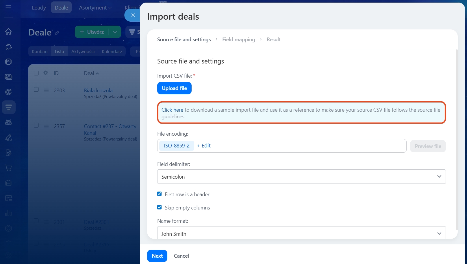 Podczas importu nie można zaktualizować istniejących deali. Jeśli w CRM istnieje deal o tej samej nazwie, zostanie dodany ponownie. W przypadku firm i kontaktów możesz wybrać sposób obsługi duplikatów.