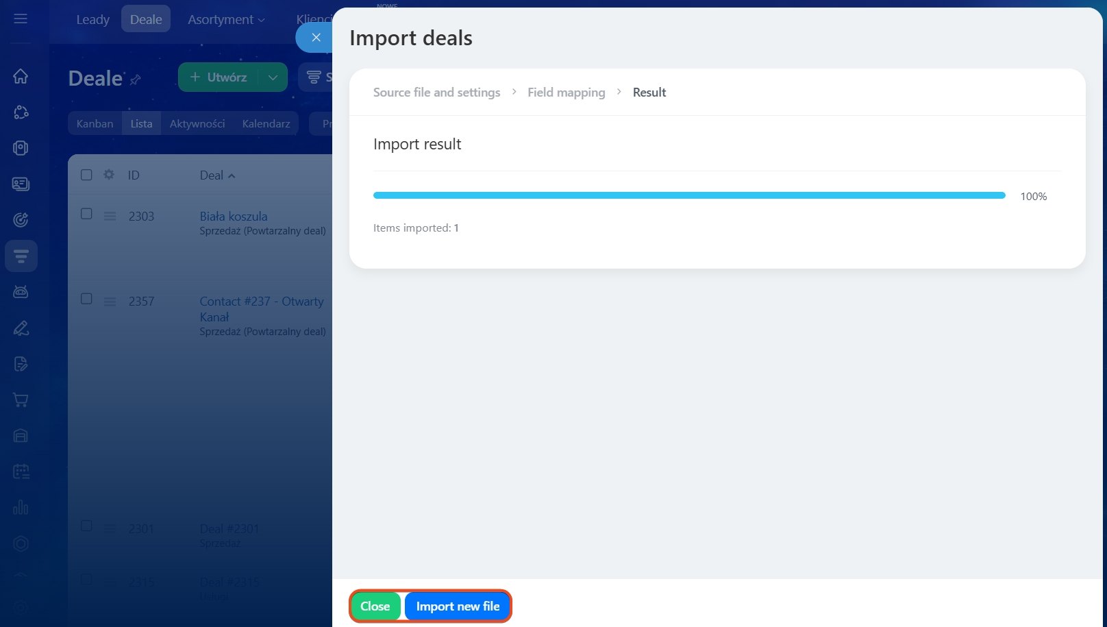 Zakończ import. Jeśli chcesz wgrać kolejny plik, kliknij Zacznij od nowa. Formularze deali pojawią się w sekcji CRM > Deale.