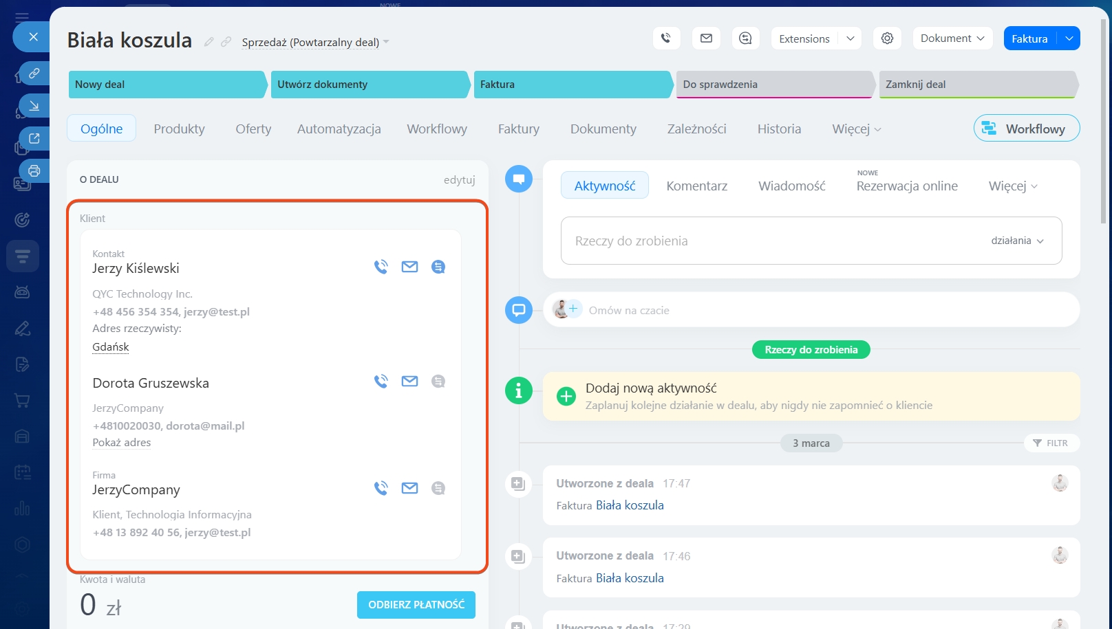 Aby sprawdzić powiązania między elementami, otwórz formularz firmy, kontaktu lub deala i przejdź do zakładki Powiązania.