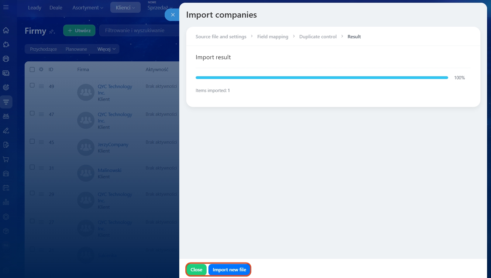 Poczekaj na zakończenie importu. Kliknij Zakończ. Jeśli chcesz wgrać kolejny plik, kliknij Zacznij od nowa. Formularze firm pojawią się w sekcji CRM > Klienci > Firmy.