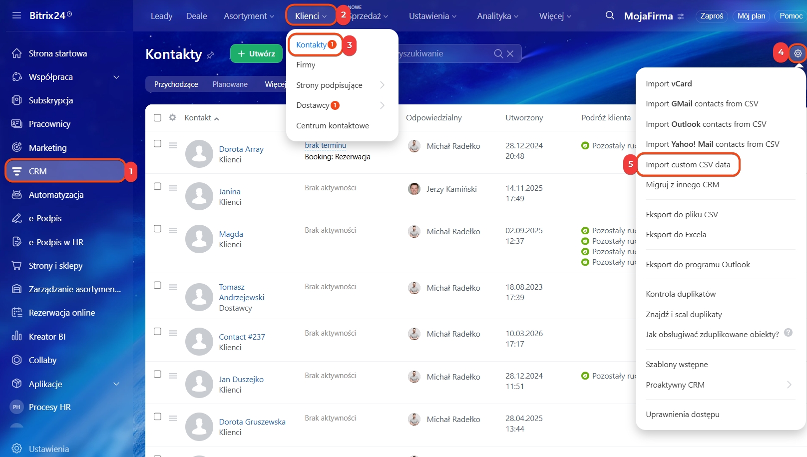 - Przejdź do CRM > Klienci > Kontakty. Kliknij Ustawienia (⚙️) i wybierz Import z CSV z własnymi ustawieniami.